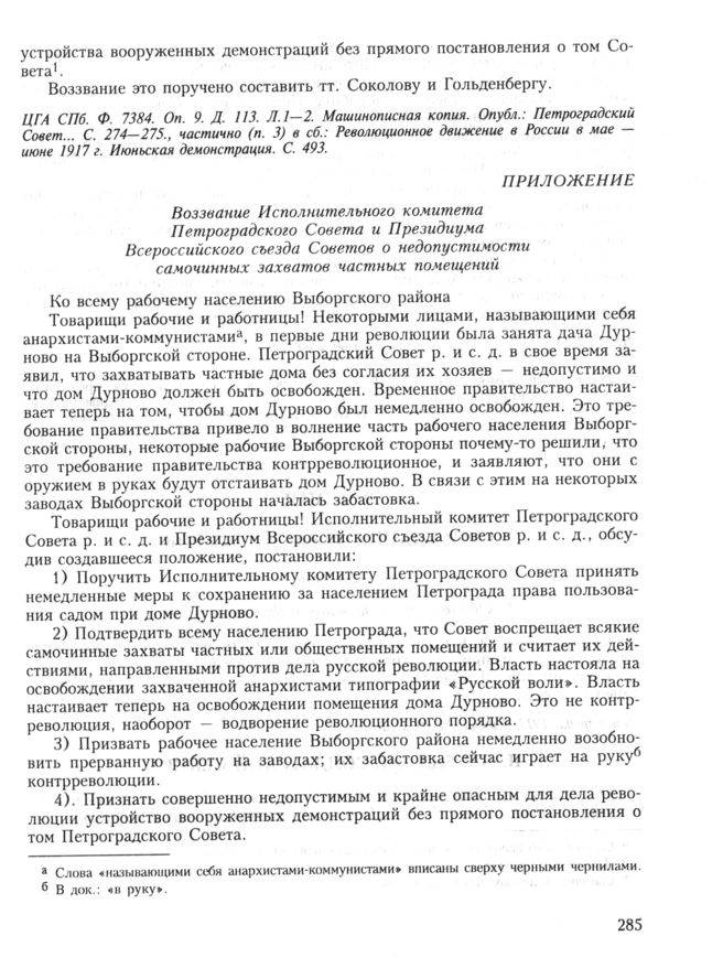 8 июня. I. Заседание Бюро Исполнительного комитета. Приложение. Воззвание Исполнительного комитета Петроградского Совета и Президиума Всероссийского съезда Советов о недопустимости самочинных захватов частных помещений // ЦГА СПб. Ф. 7384. Oп. 9. Д. 127. Л. 1—1 об. Подлинник.