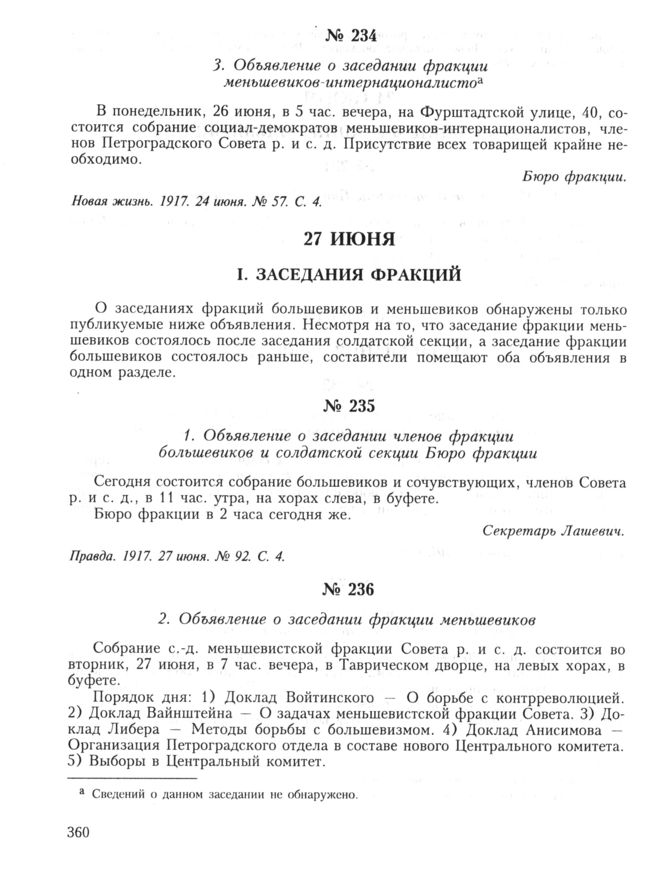 27 июня. I. Заседания фракций. 2. Объявление о заседании фракции меньшевиков // Рабочая газета. 1917. 27 июня. № 91. С. 1.