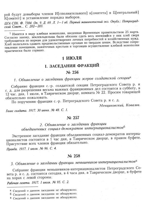 1 июля. I. Заседания фракций. 1. Объявление о заседании фракции эсеров солдатской секции // Голос солдата. 1917. 30 июня. № 48. С. 1.