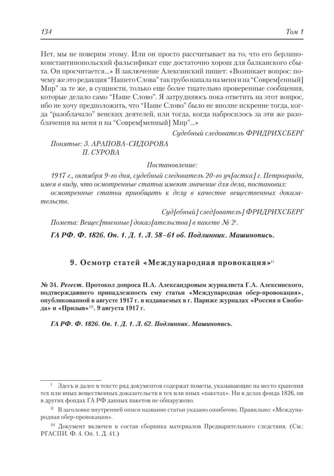 Регест. Протокол допроса П.А. Александровым журналиста Г.А. Алексинского, подтверждавшего принадлежность ему статьи «Международная обер-провокация», опубликованной в августе 1917 г. в издаваемых в г. Париже журналах «Россия и Свобода » и «Призыв». 9 августа 1917 г. // ГА РФ. Ф. 1826. Оп. 1. Д. 1. Л. 62. Подлинник. Машинопись.