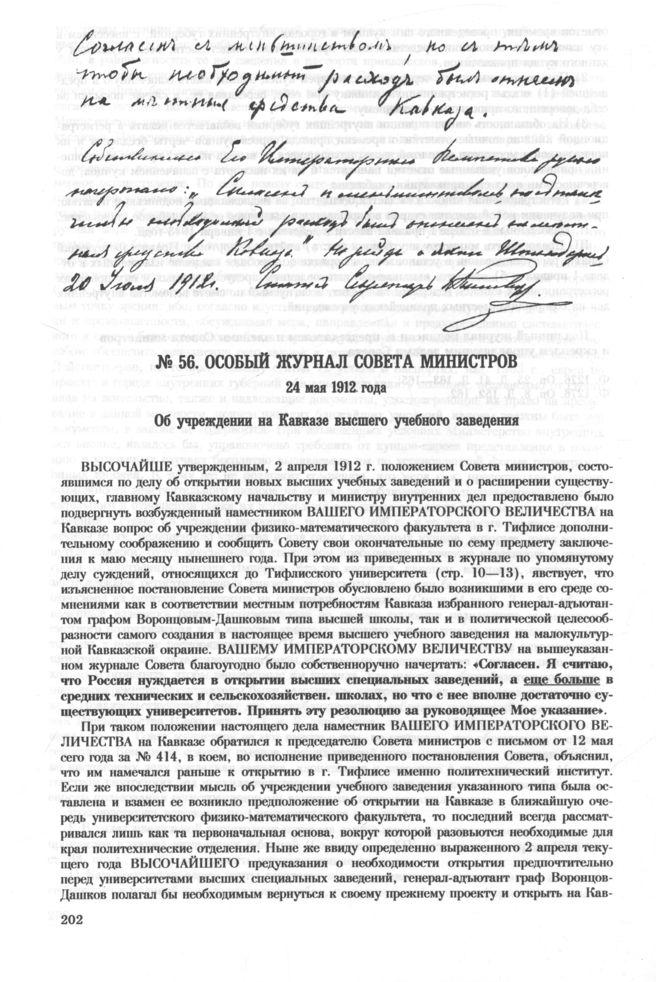 Особый журнал Совета министров. 24 мая 1912 года. Об учреждении на Кавказе высшего учебного заведения // РГИА Ф. 1276. Оп. 20. Д. 58. Л. 53—61 об.; РГИА Ф. 1276. Оп. 8. Д. 526.