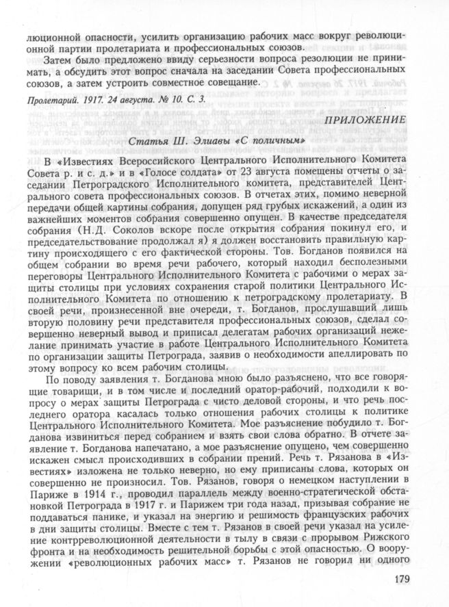 22 августа. II. Совместное заседание Исполнительного комитета, Совета профессиональных союзов и Центрального совета фабрично-заводских комитетов. Приложение. Статья Ш. Элиавы «С поличным» // Рабочий. 1917. 26 августа. № 2. С. 12—13.