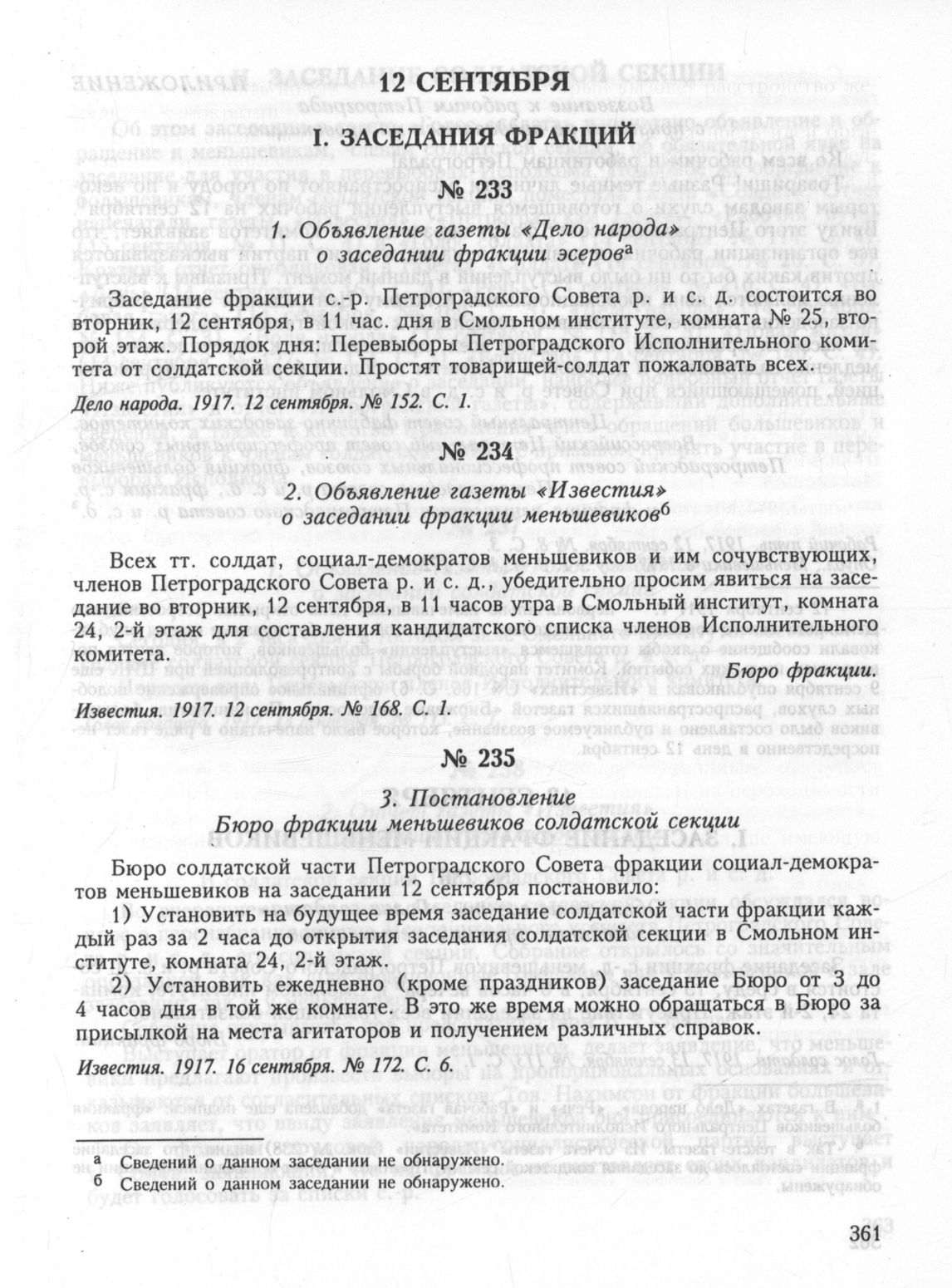 12 сентября. I. Заседания фракций. 3. Постановление Бюро фракции меньшевиков солдатской секции // Известия. 1917. 16 сентября. № 172. С. 6.