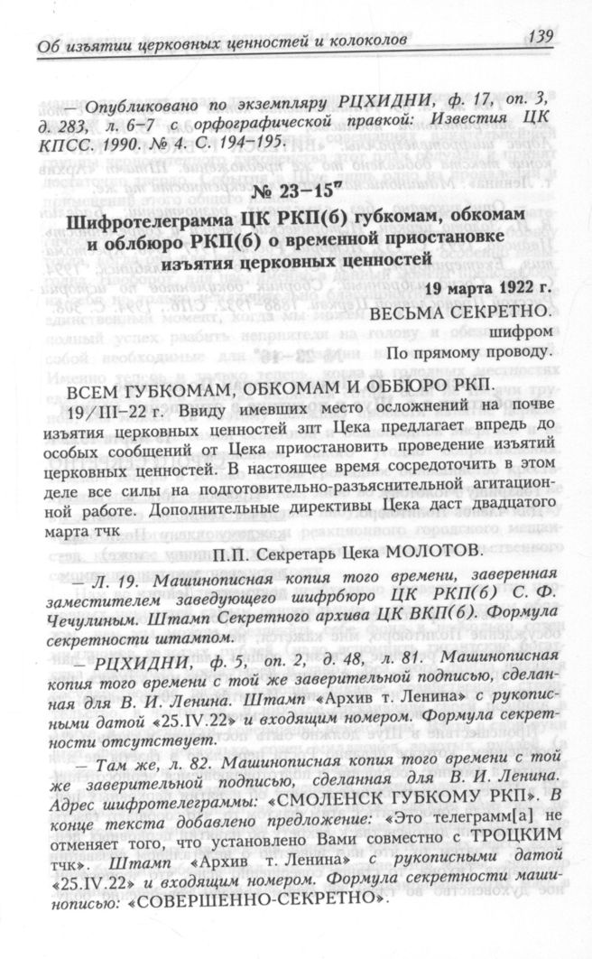 Шифротелеграмма ЦК РКП(б) губкомам, обкомам и облбюро РКП(б) о временной приостановке изъятия церковных ценностей. 19 марта 1922 г. // АПРФ, ф. 3, оп. 60, д. 23, л. 19.; РЦХИДНИ, ф. 5, oп. 2, д. 48, л. 81.; РЦХИДНИ, ф. 5, oп. 2, д. 48, л. 82.; РЦХИДНИ, ф. 5, oп. 2, д. 48, л. 83.; Баделин B. И. Золото церкви. Исторические очерки и современность. Иваново, 1993. С. 133.; История России. 1917-1940. Хрестоматия. Екатеринбург, 1993. С. 226.; История России. 1917-1940. Хрестоматия. Челябинск, 1994. C. 226.; Сосуд избранный: Сборник документов по истории Русской Православной Церкви. 1888-1932. СПб., 1994. С. 308.