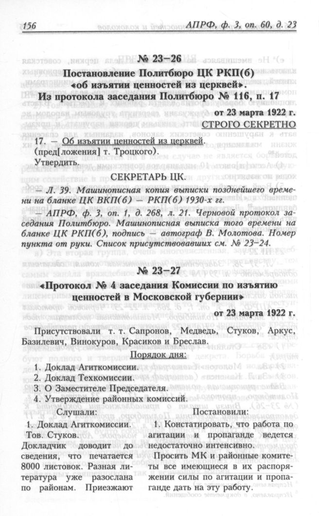 Протокол № 4 заседания Комиссии по изъятию ценностей в Московской губернии» от 23 марта 1922 г. // АПРФ, ф. 3, оп. 60, д. 23, л. 44-46. ; АПРФ, ф. 3, oп. 1, д. 269, л. 10-11.; ЦА ФСБ, ф. 1, oп. 6, д. 410а, л. 15-16.