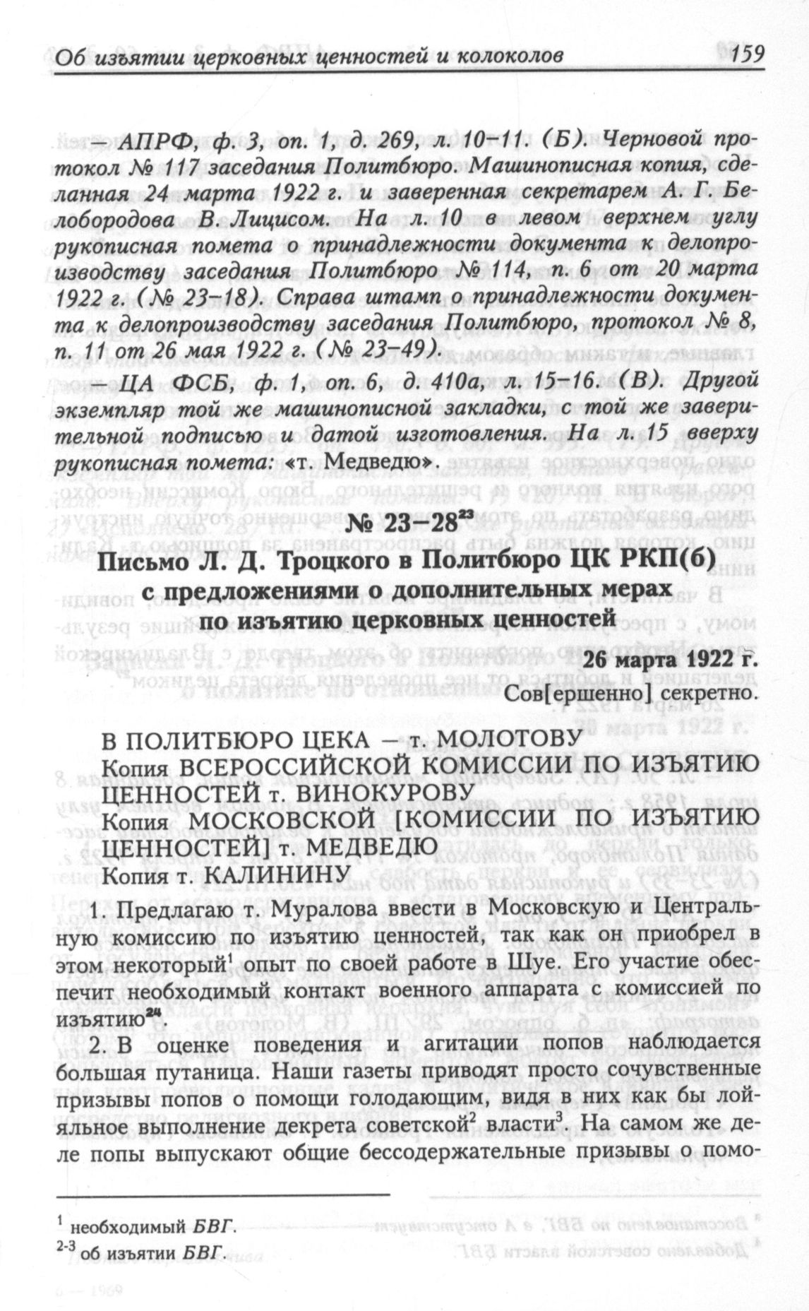 Письмо Л. Д. Троцкого в Политбюро ЦК РКП(б) с предложенииями о дополнительных мерах по изъятию церковных ценностей. 26 марта 1922 г. // АПРФ, ф. 3, оп. 60, д. 23, л. 50.; АПРФ, ф. 3, oп. 1, д. 269, л. 20.; ЦА ФСБ, ф. 1, oп. 6, д. 410а, л. 27.; ГА РФ, ф. 1235, oп. 140, д. 60, л. 393.