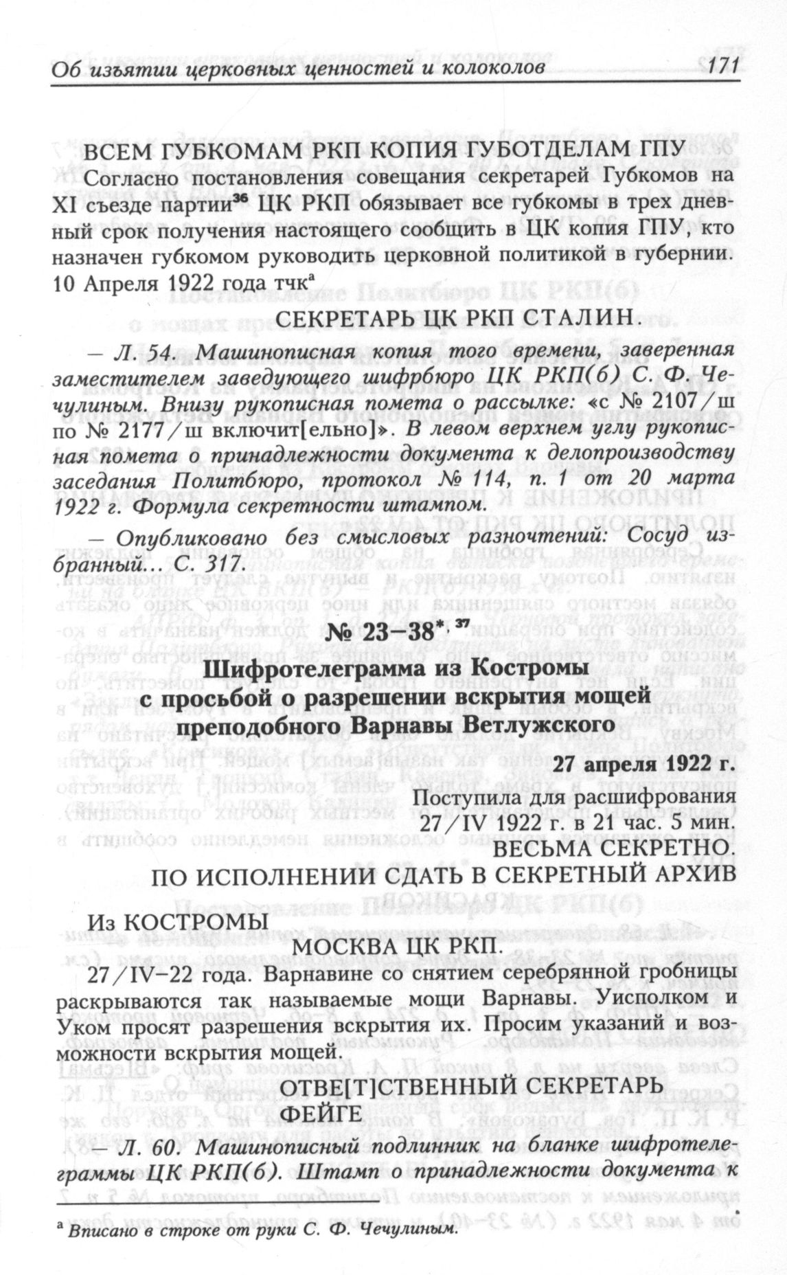 Шифротелеграмма из Костромы с просьбой о разрешении вскрытия мощей преподобного Варнавы Ветлужского. 27 апреля 1922 г.