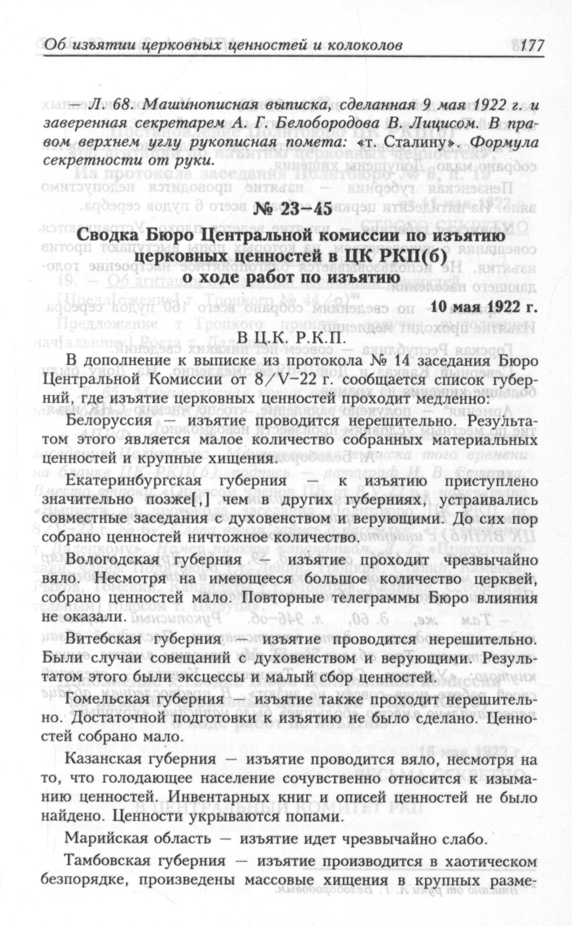 Сводка Бюро Центральной комиссии по изъятию церковных ценностей в ЦК РКП(б) о ходе работ по изъятию. 10 мая 1922 г. // АПРФ, ф. 3, оп. 60, д. 23, л. 69.; ГА РФ, ф. 1235, oп. 140, д. 59, л. 59.; ГА РФ, ф. 1235, oп. 140, д. 60, л. 946-об.