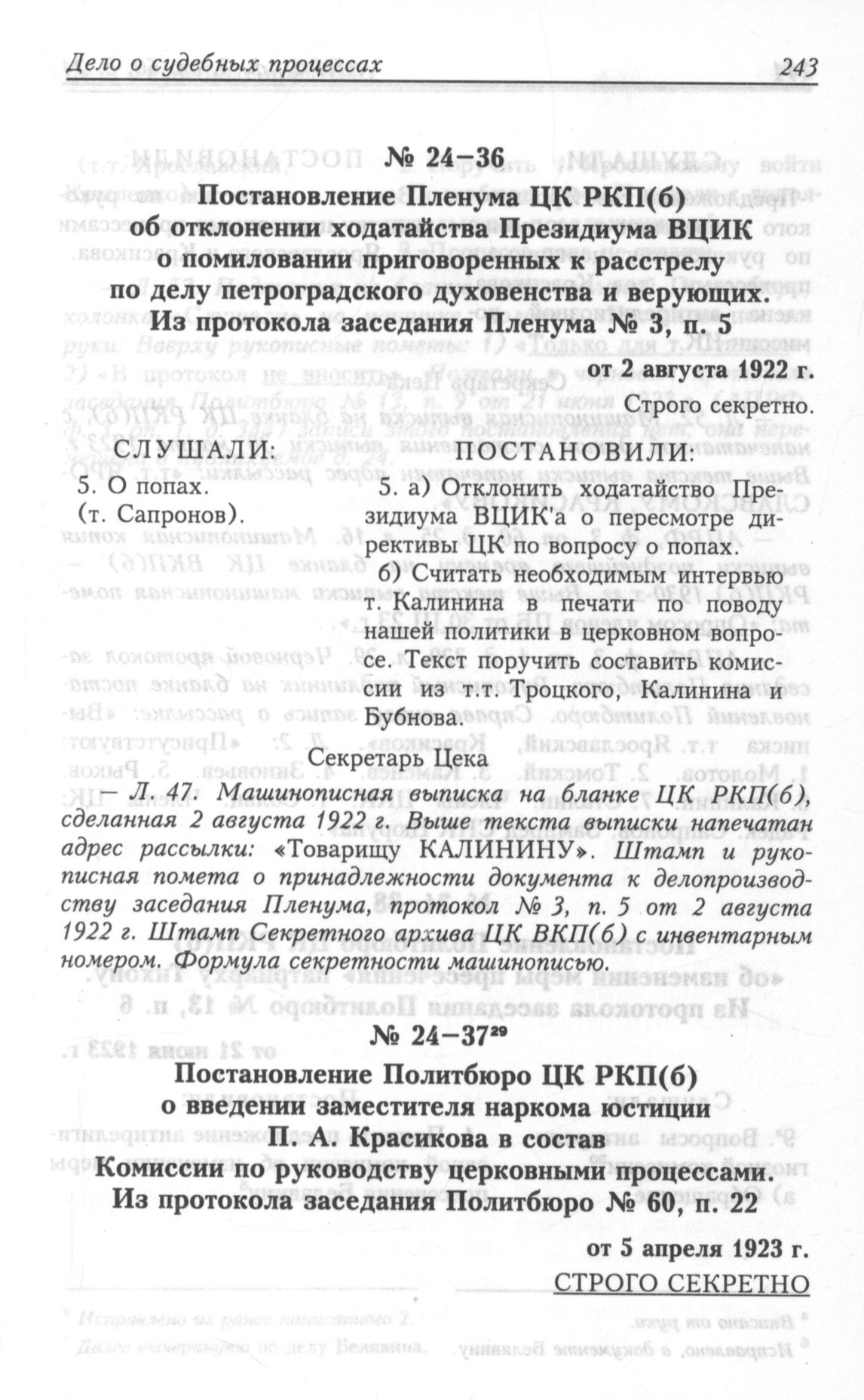 Постановление Политбюро ЦК РКП(б) о введении заместителя наркома юстиции П. А. Красикова в состав Комиссии по руководству церковными процессами. Из протокола заседания Политбюро № 60, п. 22 от 5 апреля 1923 г. // АПРФ, ф. 3, oп. 60, д. 24, л. 52.; АПРФ, ф. 3, oп. 60, д. 25, л. 16.; АПРФ, ф. 3, oп. 1, д. 329, л. 29.