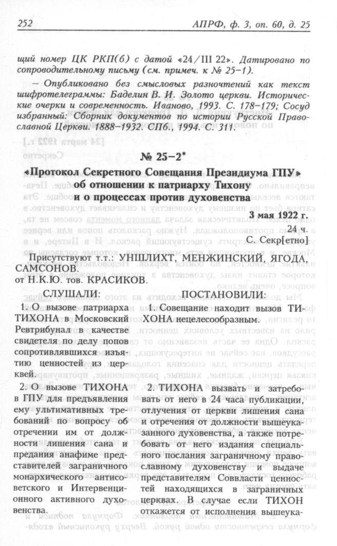 Протокол Секретного Совещания Президиума ГПУ об отношении к патриарху Тихону и о процессах против духовенства. 3 мая 1922 г. // АПРФ, ф. 3, oп. 60, д. 25, л. 4-об.; ЦА ФСБ, ф. 1, oп. 6, д. 11, л. 127-об.
