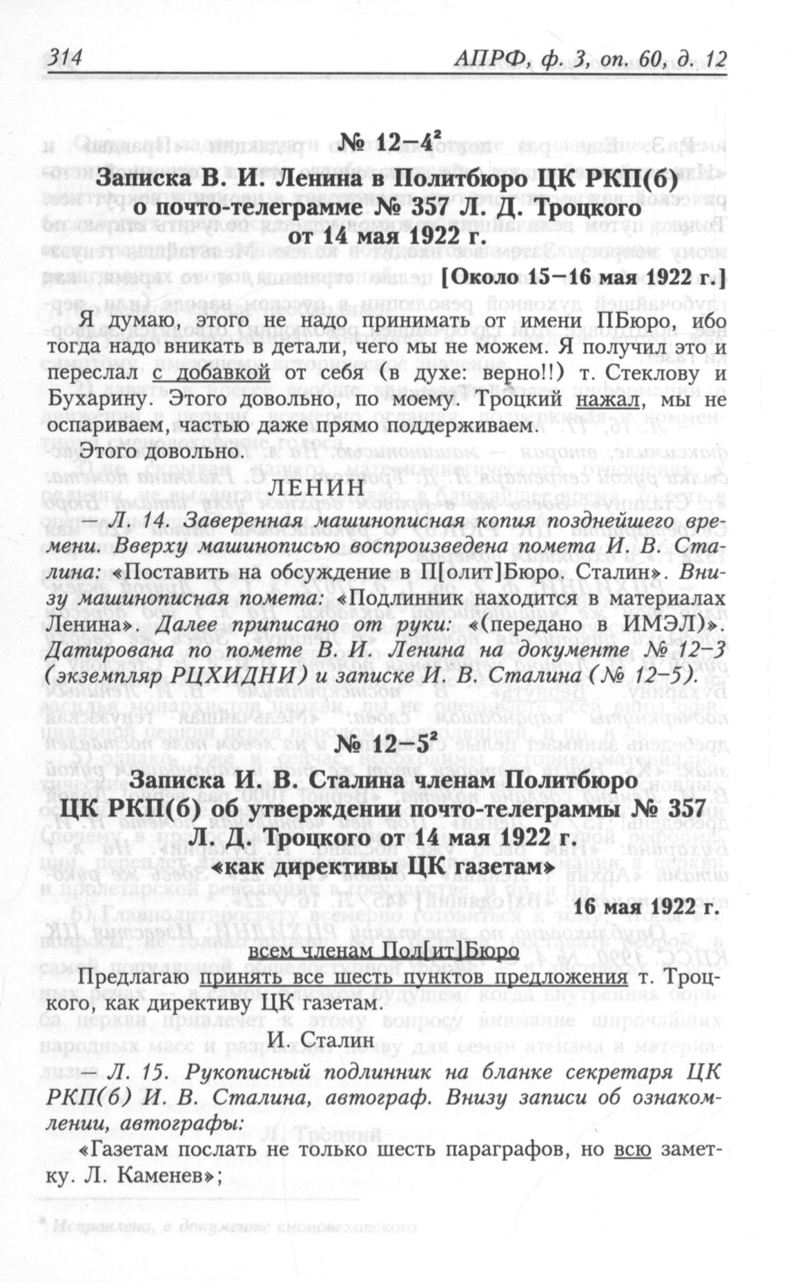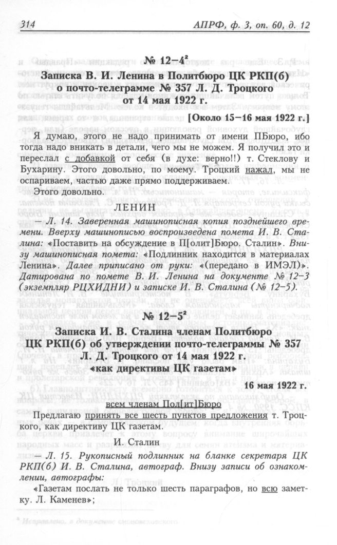 Записка И. В. Сталина членам Политбюро ЦК РКП(б) об утверждении почто-телеграммы № 357 Л. Д . Троцкого от 14 мая 1922 г. «как директивы ЦК газетам». 16 мая 1922 г. // АПРФ, ф. 3, oп. 60, д. 12, л. 15.