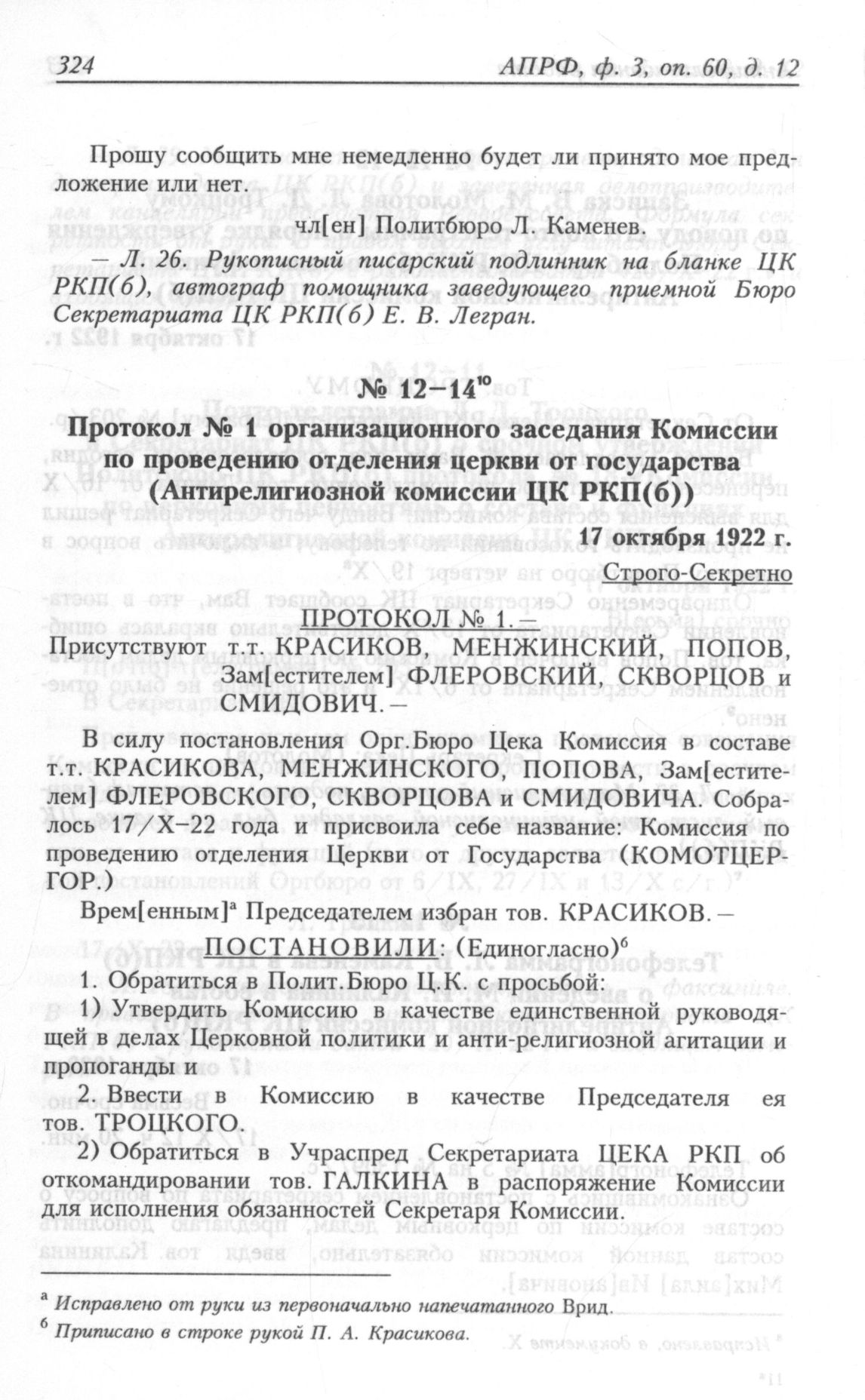 Протокол № 1 организационного заседания Комиссии по проведению отделения церкви от государства (Антирелигиозной комиссии ЦК РКП(б)). 17 октября 1922 г. // АПРФ, ф. 3, oп. 60, д. 12, л. 30.