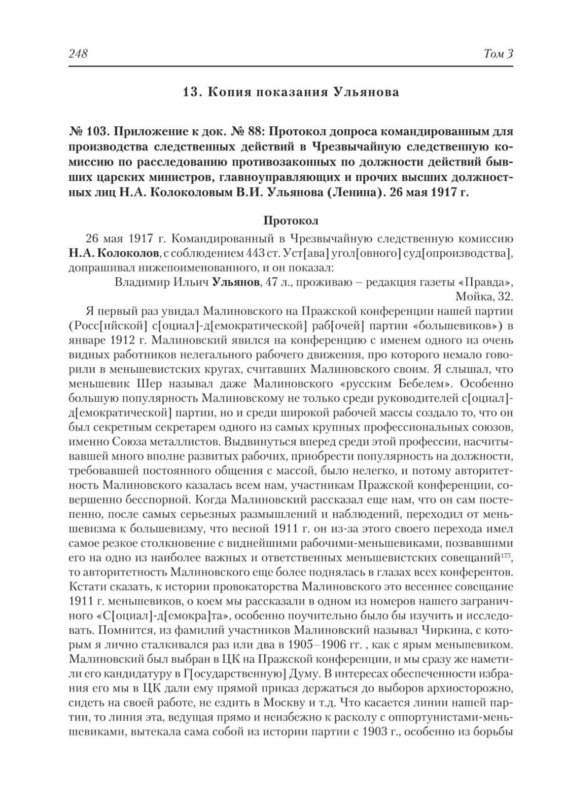 Приложение к док. № 88: Протокол допроса командированным для производства следственных действий в Чрезвычайную следственную комиссию для расследования противозаконных по должности действий бывших царских министров, главноуправляющих и прочих высших должностных лиц Н.А. Колоколовым В.И. Ульянова (Ленина). 26 мая 1917 г. : Протокол // РГАСПИ. Ф. 4. Оп. 3. Д. 42. Л. 32–35. Заверенная копия. Машинопись.; Опубл.: Дело провокатора Малиновского. С. 49–54.