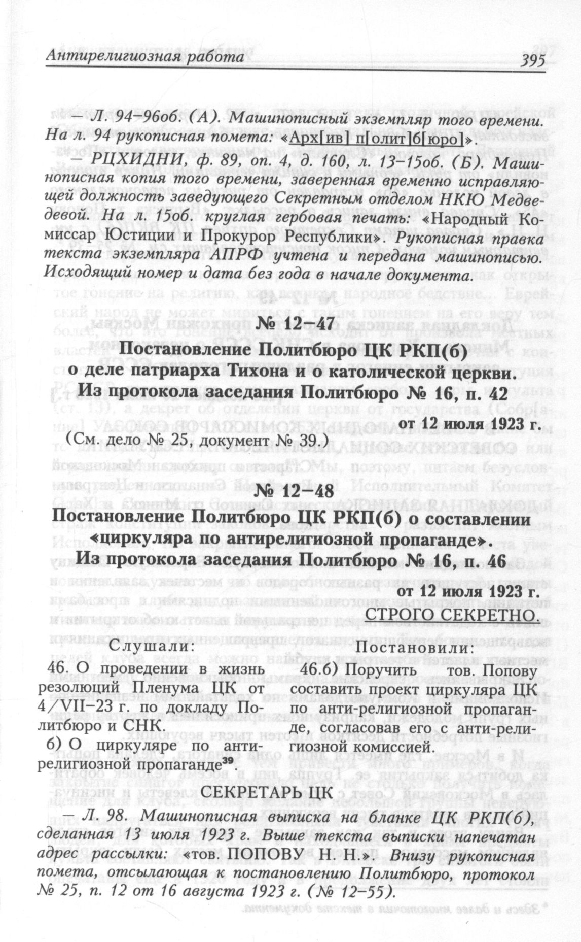 Постановление Политбюро ЦК РКП(б) о деле патриарха Тихона и о католической церкви. Из протокола заседания Политбюро № 16, п. 42 от 12 июля 1923 г. // АПРФ, ф. 3, oп. 60, д. 25, л. 55.; АПРФ, ф. 3, oп. 60, д. 12, л. 97.; АПРФ, ф. 3, oп. 1, д. 347, л. 55.