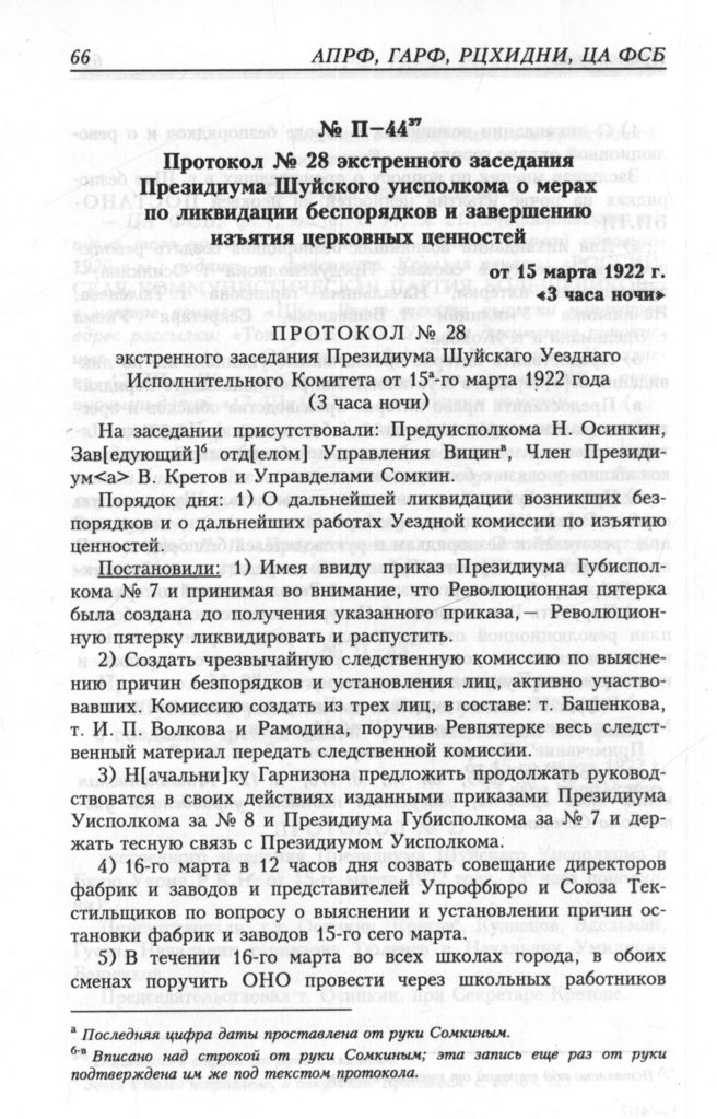 Протокол № 28 экстренного заседания Президиума Шуйского уисполкома о мерах по ликвидации беспорядков и завершению изъятия церковных ценностей от 15 марта 1922 г. «3 часа ночи»