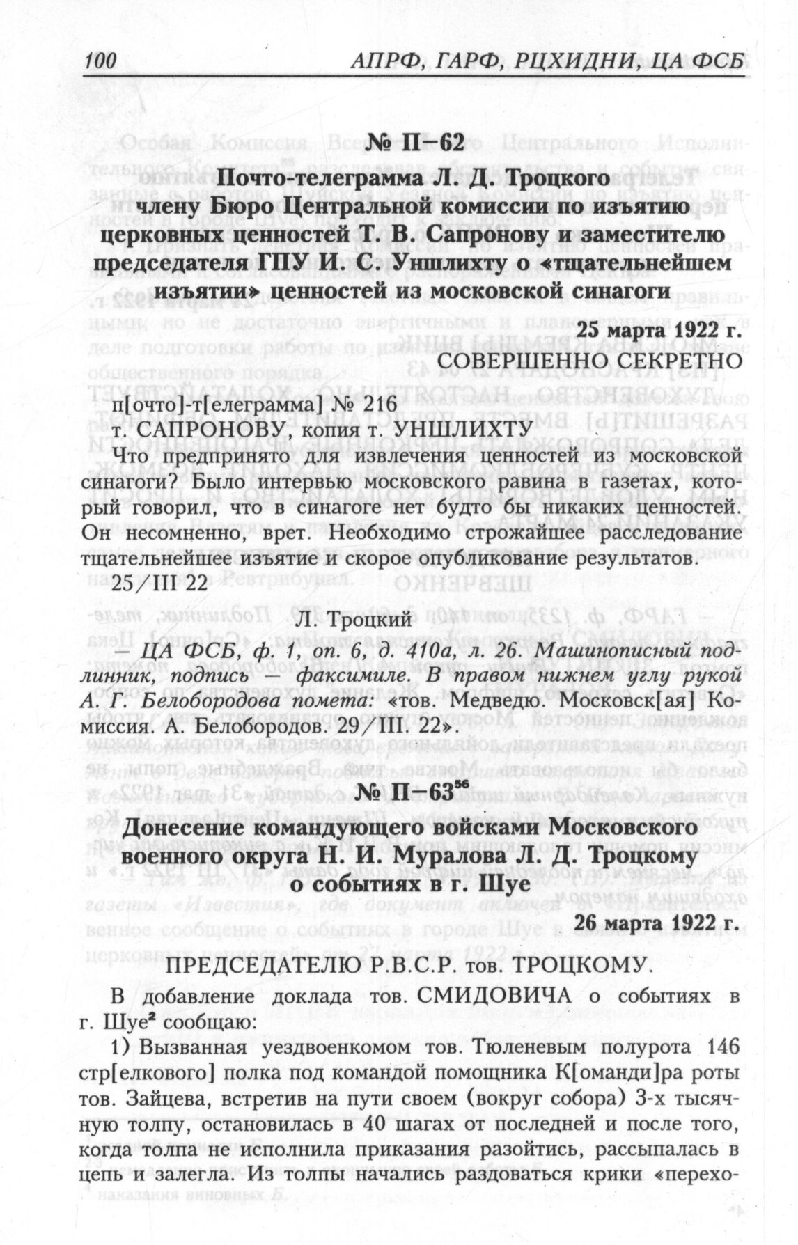 Почто-телеграмма Л. Д. Троцкого члену Бюро Центральной комиссии по изъятию церковных ценностей Т. В. Сапронову и заместителю председателя ГПУ И. С. Уншлихту о «тщательнейшем изъятии» ценностей из московской синагоги. 25 марта 1922 г. // ЦА ФСБ, ф. 1, oп. 6, д. 410а, л. 26.