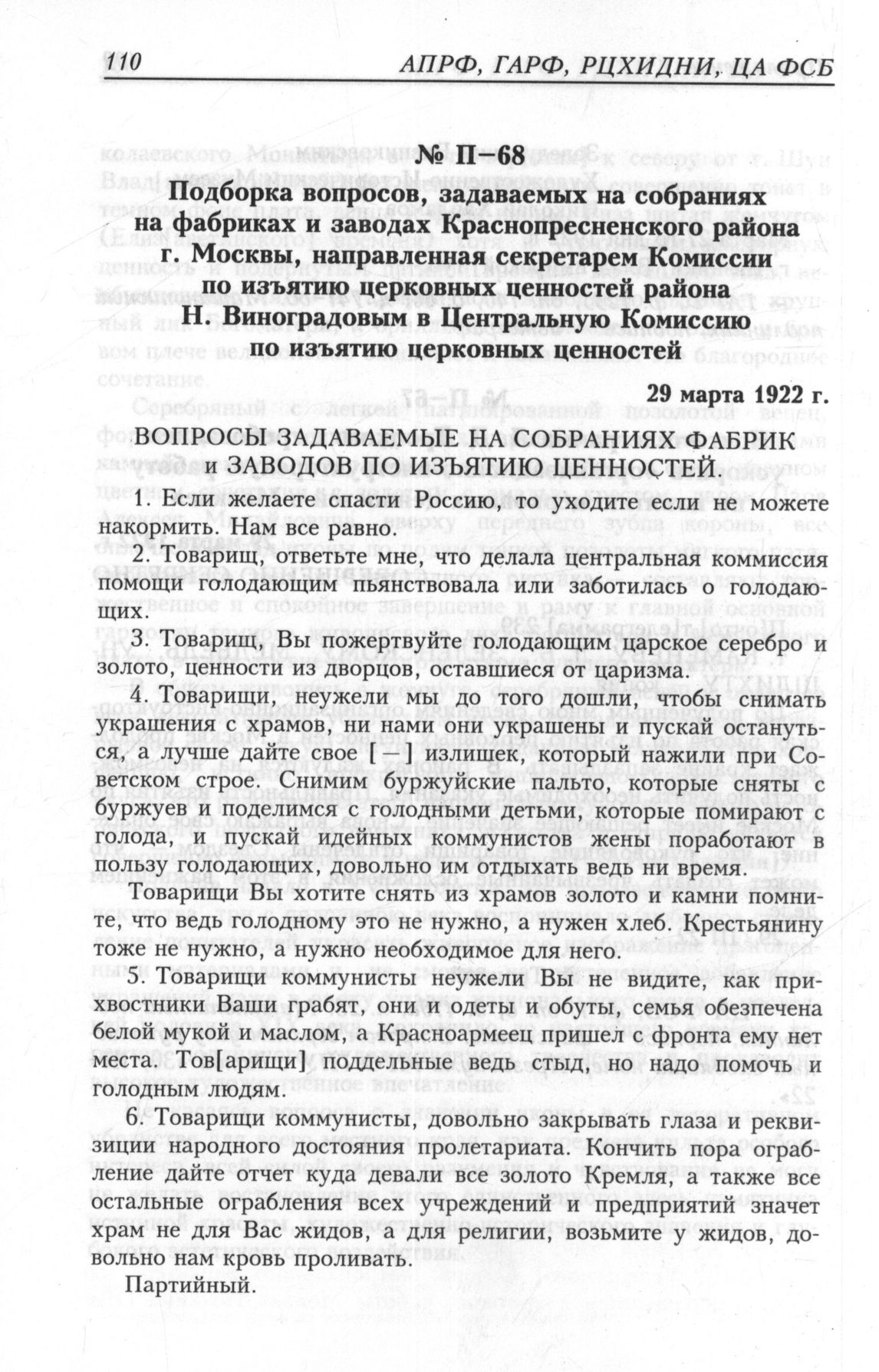 Подборка вопросов, задаваемых на собраниях на фабриках и заводах Краснопресненского района г. Москвы, направленная секретарем Комиссии по изъятию церковных ценностей района Н. Виноградовым в Центральную Комиссию по изъятию церковных ценностей. 29 марта 1922 г. // ГА РФ, ф. 1235, oп. 140, д. 59, л. 68-об.