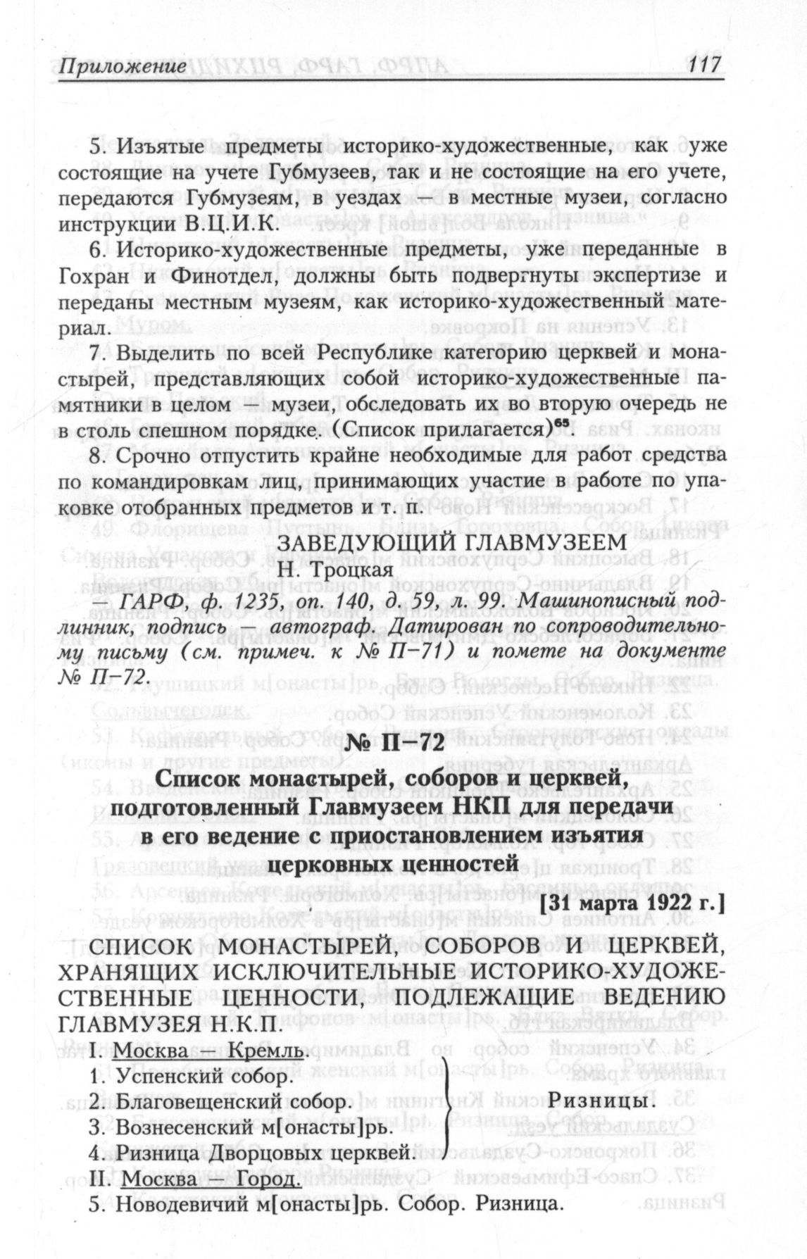 Список монастырей, соборов и церквей, подготовленный Главмузеем НКП для передачи в его ведение с приостановлением изъятия церковных ценностей [31 марта 1922 г.] // ГА РФ, ф. 1235, oп. 140, д. 59, л. 110-111 об.