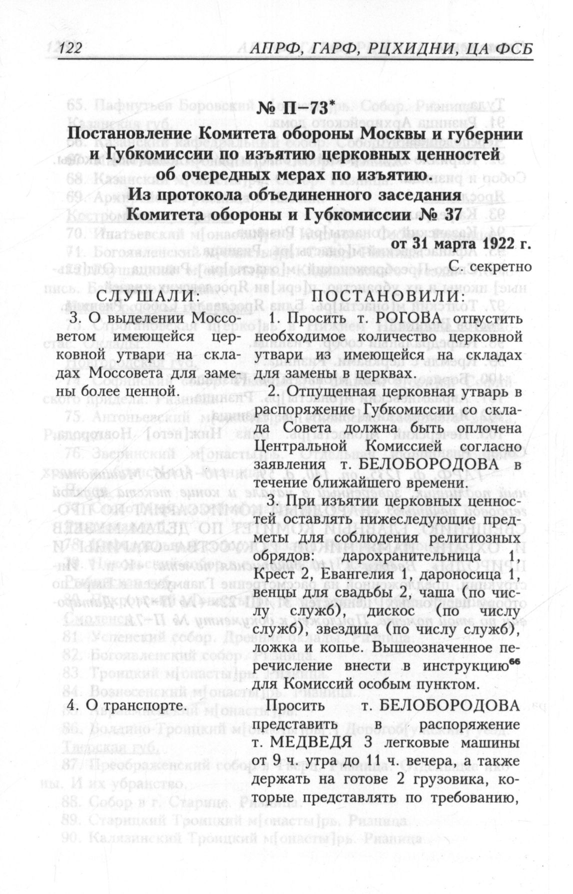 Постановление Комитета обороны Москвы и губернии и Губкомиссии по изъятию церковных ценностей об очередных мерах по изъятию. Из протокола объединенного заседания Комитета обороны и Губкомиссии № 37 от 31 марта 1922 г.