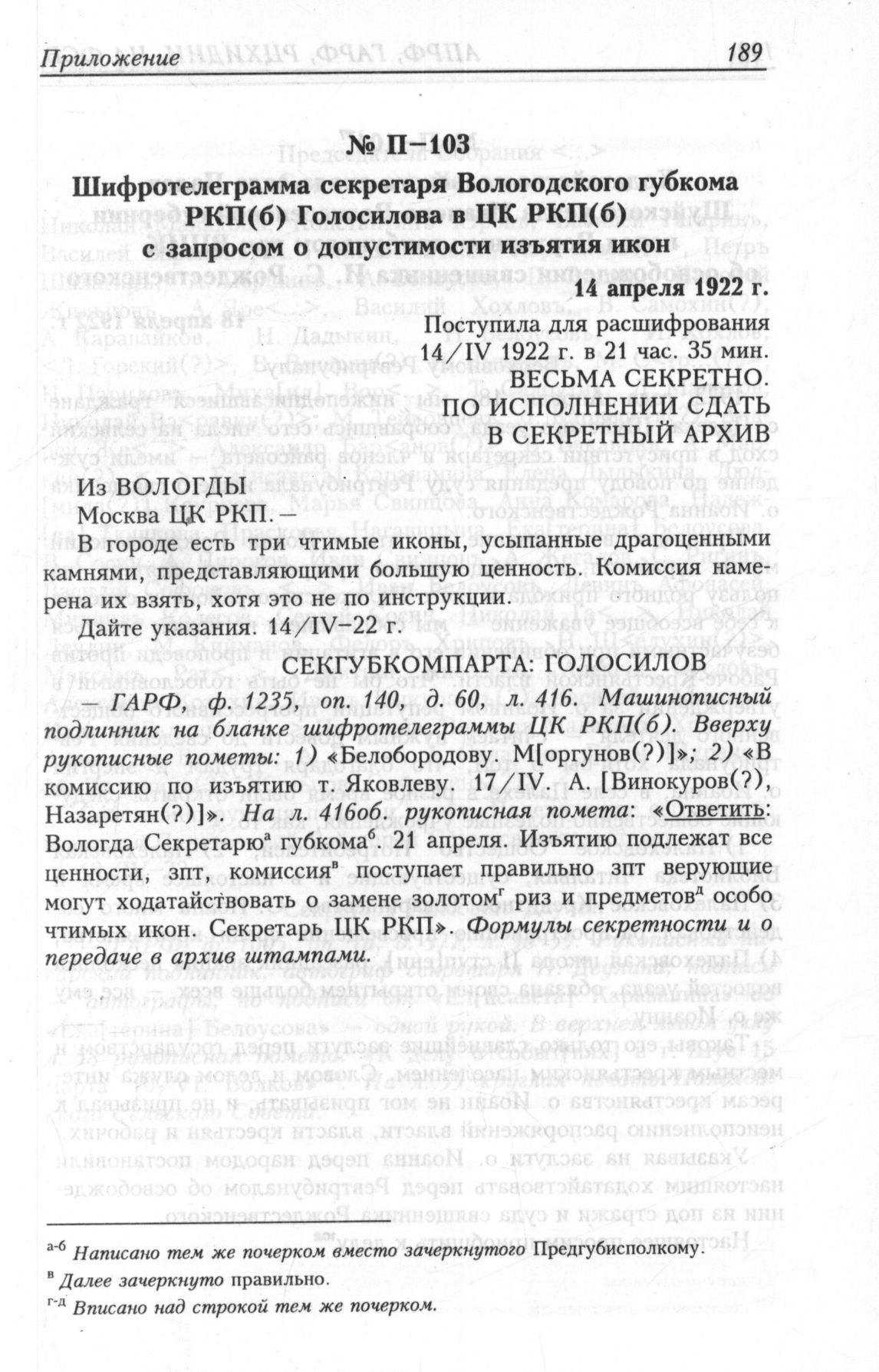 Шифротелеграмма секретаря Вологодского губкома РКП(б) Голосилова в ЦК РКП(б) с запросом о допустимости изъятия икон. 14 апреля 1922 г. // ГА РФ, ф. 1235, oп. 140, д. 60, л. 416.