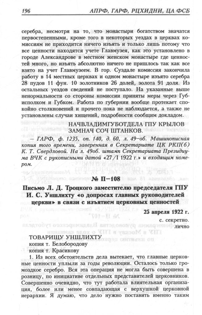 Письмо Л. Д. Троцкого заместителю председателя ГПУ И. С. Уншлихту «о допросах главных руководителей церкви» в связи с изъятием церковных ценностей. 25 апреля 1922 г.