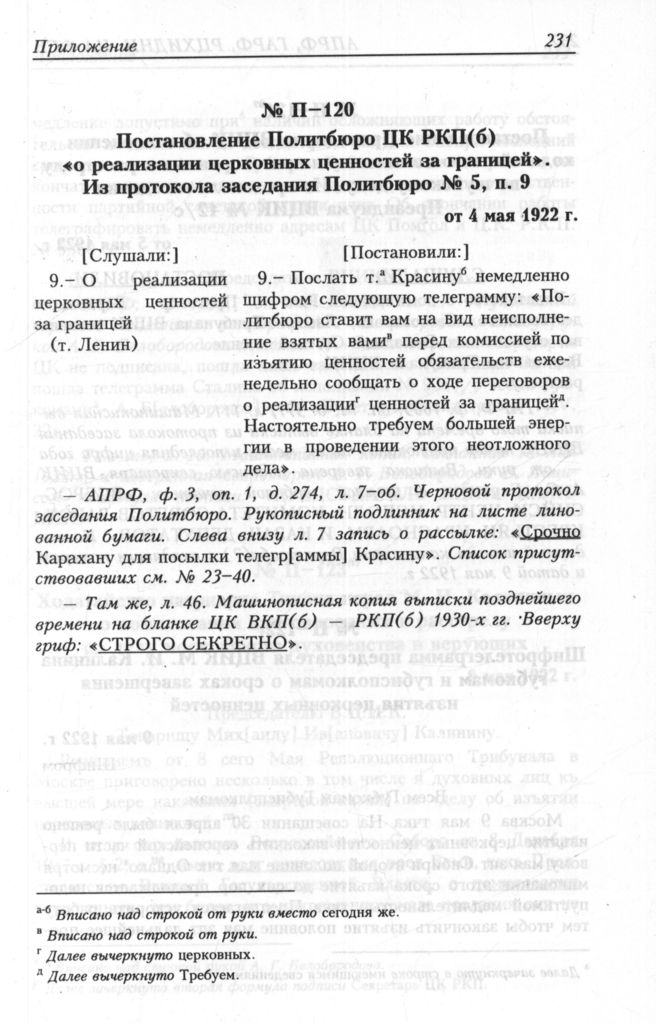 Постановление Политбюро ЦК РКП(б) «о реализации церковных ценностей за границей». Из протокола заседания Политбюро № 5, п. 9 от 4 мая 1922 г. // АПРФ, ф. 3, oп. 1, д. 274, л. 7-об.; АПРФ, ф. 3, oп. 1, д. 274, л. 46.