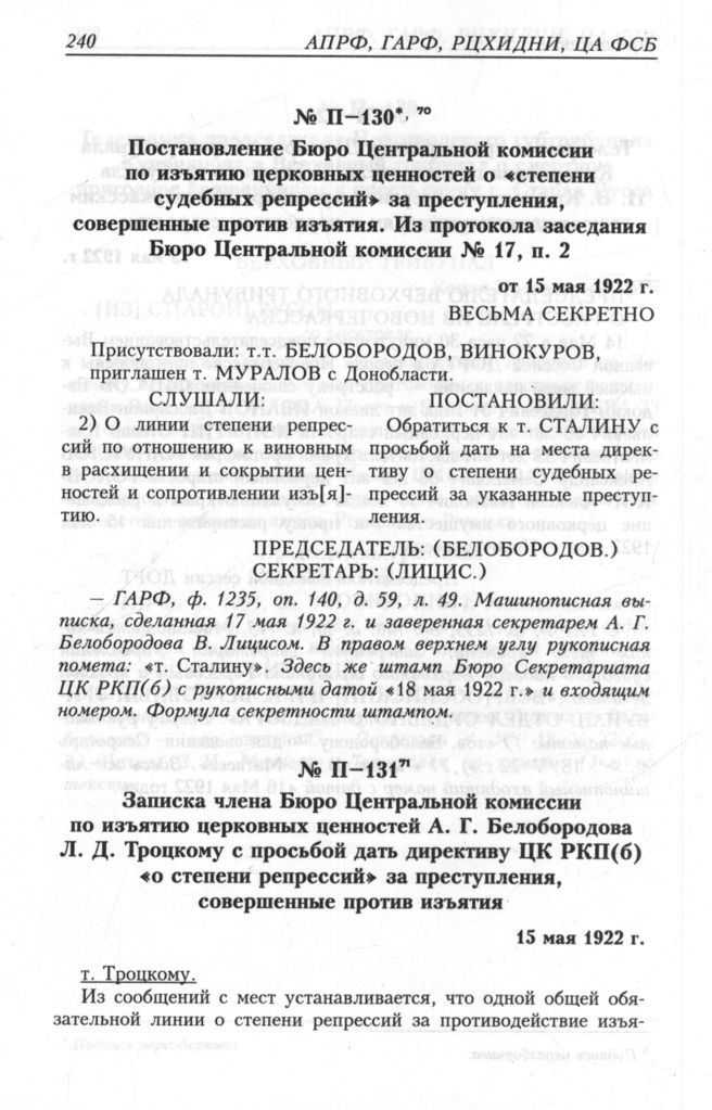 Постановление Бюро Центральной комиссии по изъятию церковных ценностей о «степени судебных репрессий» за преступления, совершенные против изъятия. Из протокола заседания Бюро Центральной комиссии № 17, п. 2 от 15 мая 1922 г. // ГА РФ, ф. 1235, oп. 140, д. 59, л. 49.