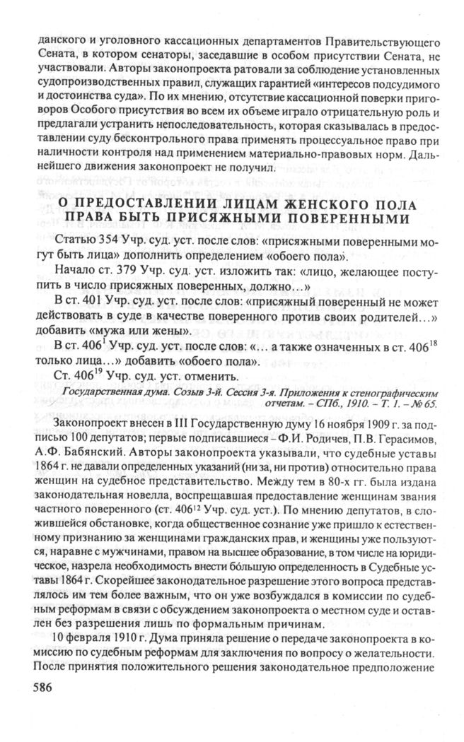 О предоставлении лицам женского пола права быть присяжными поверенными. 16 ноября 1909 г. // Государственная дума. Созыв 3-й. Сессия 3-я. Приложения к стенографическим отчетам. - СПб., 1910. - Т. 1. - № 65.