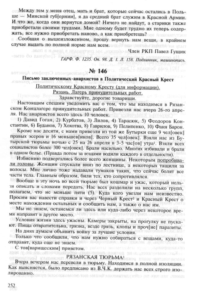 Письмо заключенных-анархистов в Политический Красный Крест // ГА РФ. Ф. 8419. Oп. 1. Д. 7. Л. 10-10об. Заверенная копия, машинопись.