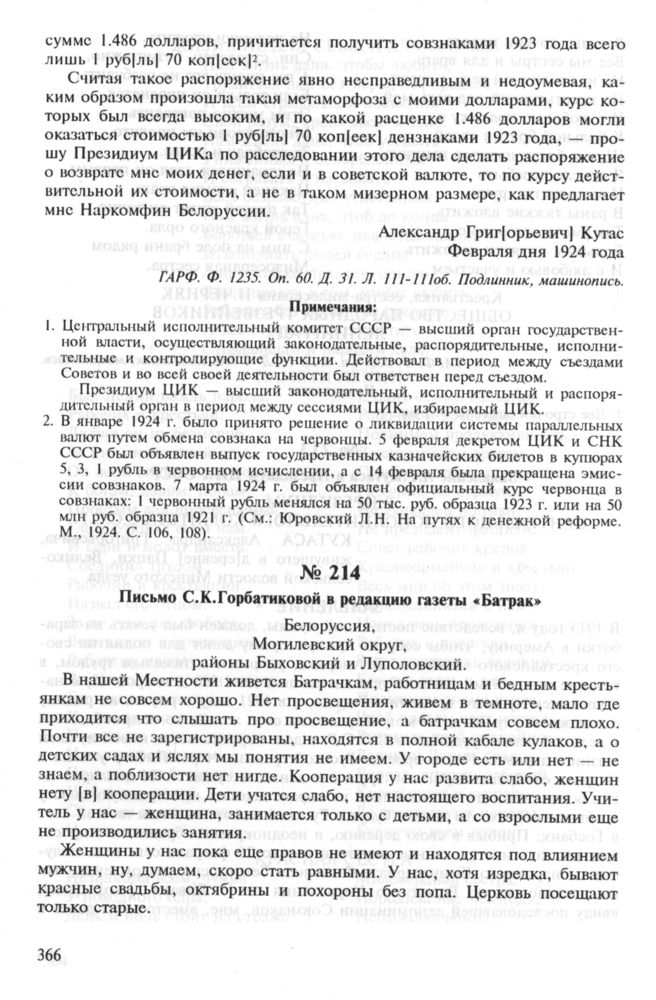 Письмо С.К.Горбатиковой в редакцию газеты «Батрак»