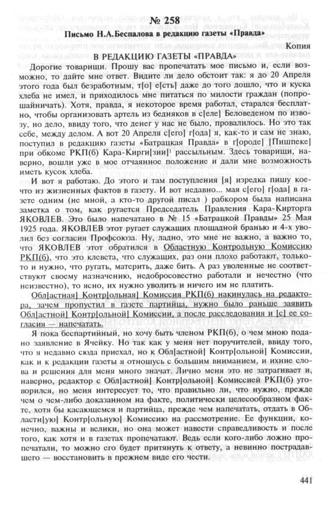 Письмо Н.А.Беспалова в редакцию газеты «Правда» // ГА РФ. Ф. 374. Oп. 27с. Д. 456. Л. 133-134. Копия, машинопись. Подчеркивания сделаны читающим.
