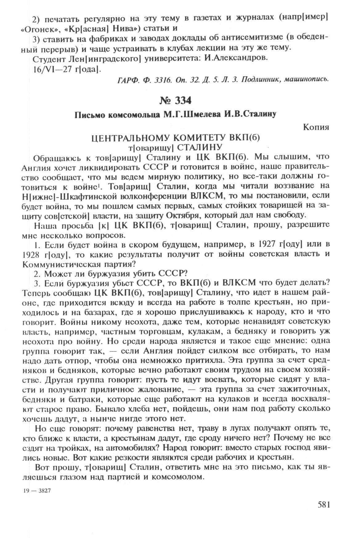 Письмо комсомольца М.Г.Шмелева И.В.Сталину // РЦХИДНИ. Ф. 17. Oп. 85. Д. 514. Л. 125. Копия, машинопись.
