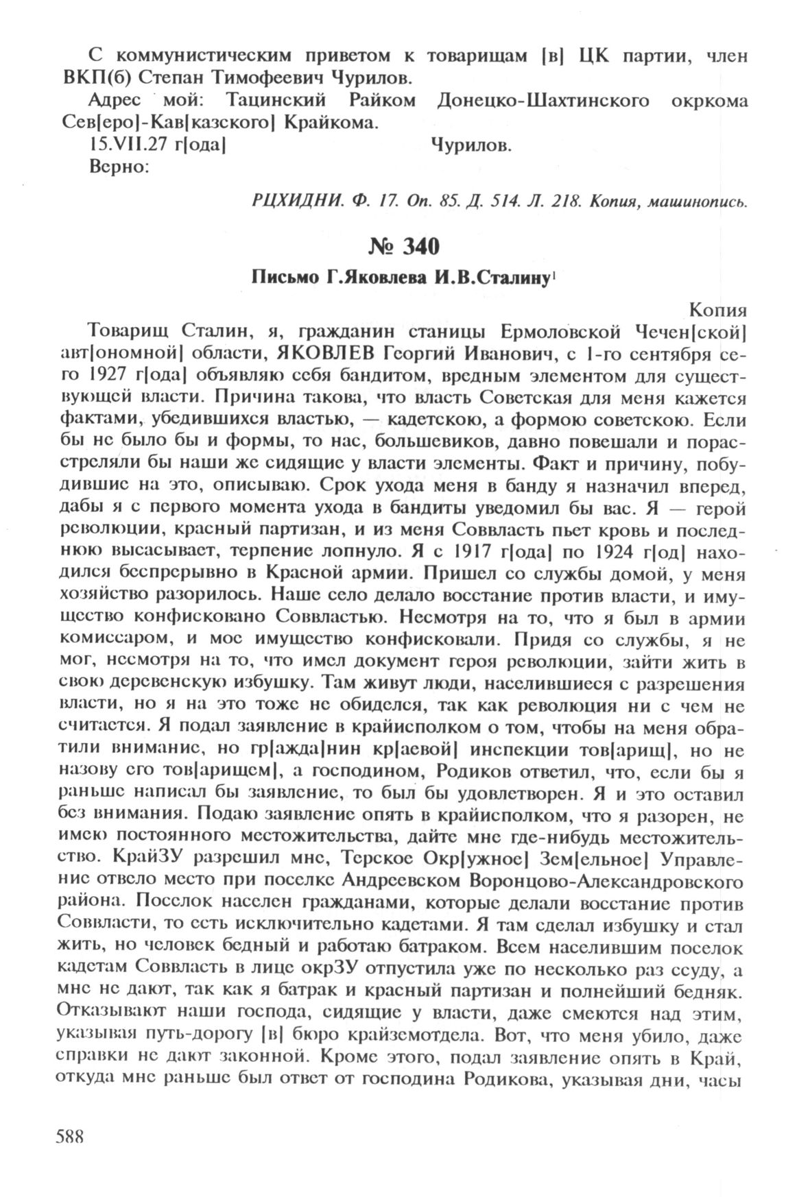 Письмо Г.Яковлева И.В.Сталину // РЦХИДНИ. Ф. 17. Oп. 85. Д. 514. Л. 257. Заверенная копия, машинопись.