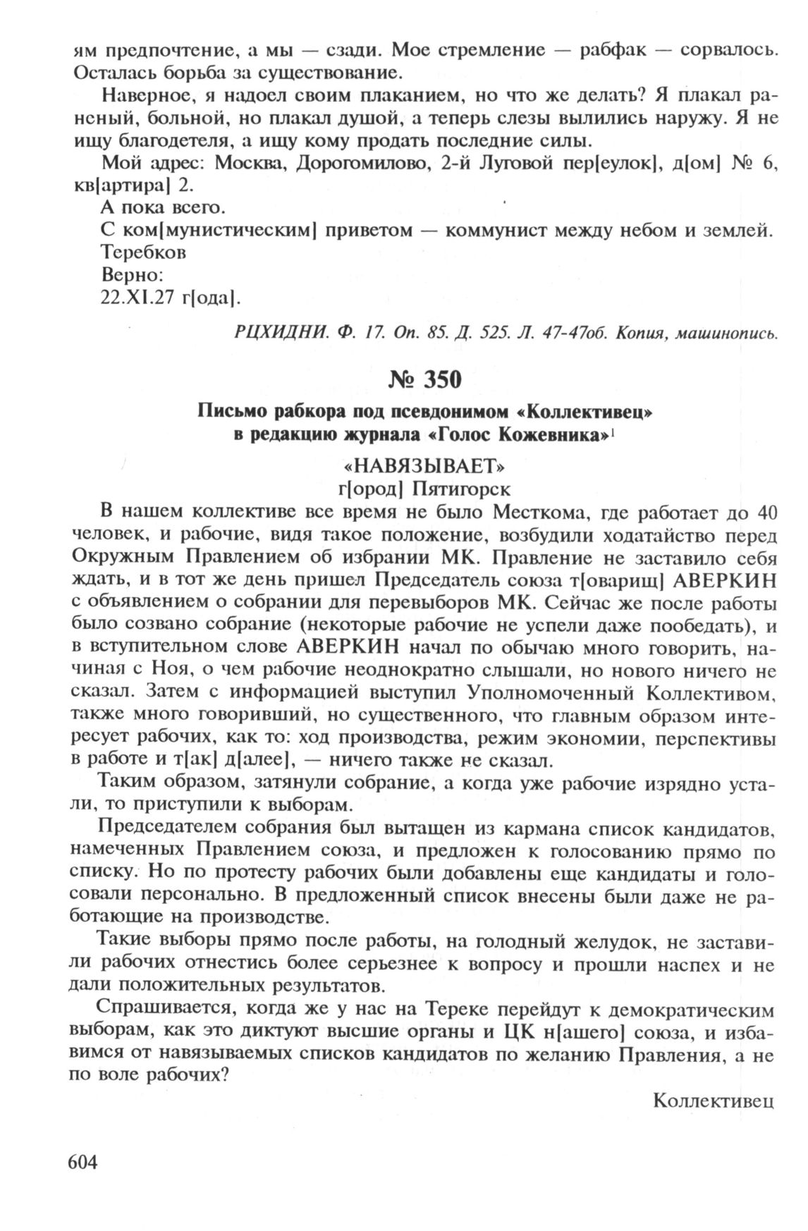 Письмо рабкора под псевдонимом «Коллективец» в редакцию журнала «Голос Кожевника» // ГА РФ. Ф. 5545. Oп. 4. Д. 8. Л. 24. Подлинник, машинопись.