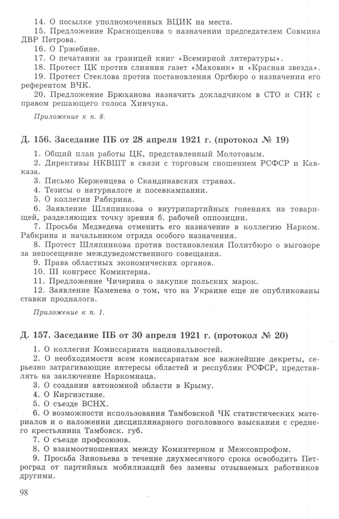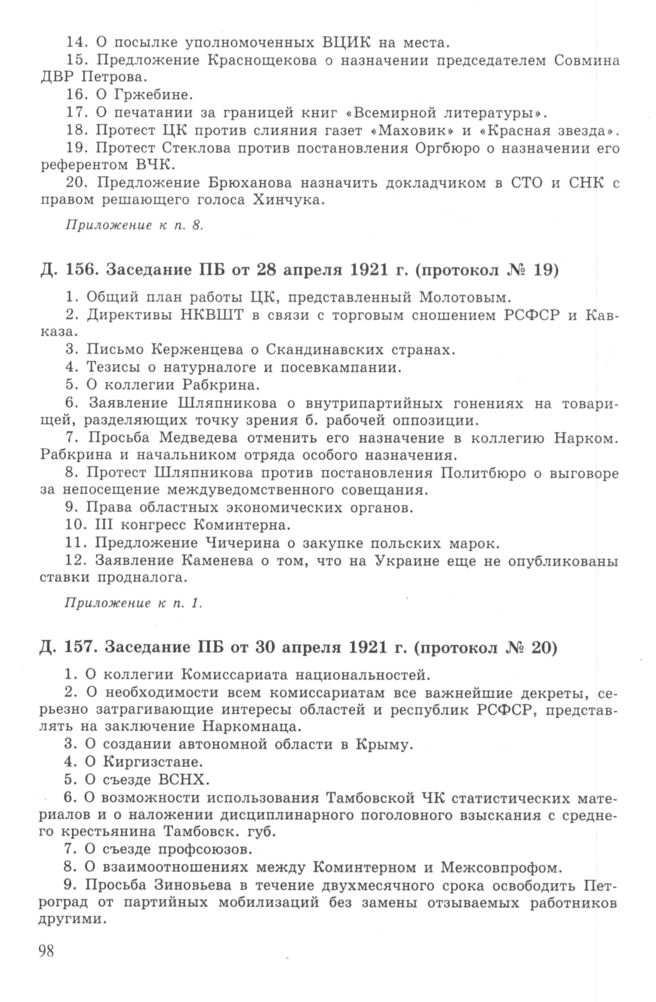 Повестка дня заседания ПБ ЦК РКП(б) от 30 апреля 1921 г. (протокол № 20) // РГАСПИ. Ф. 17. Оп. 3. Д. 157.