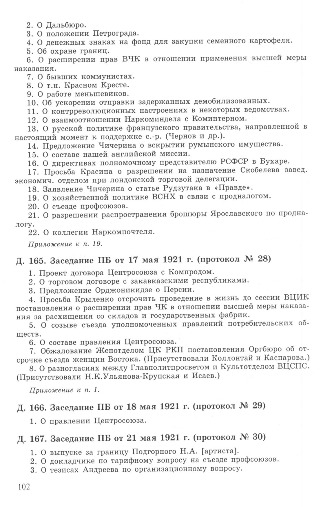 Повестка дня заседания ПБ ЦК РКП(б) от 18 мая 1921 г. (протокол № 29) // РГАСПИ. Ф. 17. Оп. 3. Д. 166.