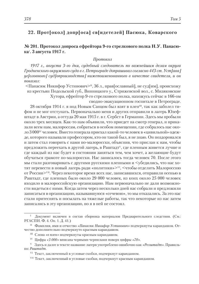 Протокол допроса ефрейтора 9-го стрелкового полка Н.У. Панасюка. 3 августа 1917 г. : Протокол // ГА РФ. Ф. 1826. Оп. 1. Д. 5. Л. 53–54. Подлинник. Машинопись.