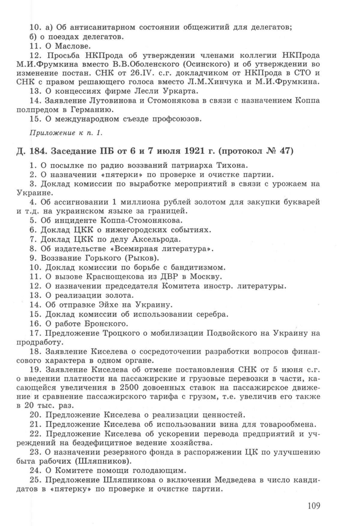 Повестка дня заседания ПБ ЦК РКП(б) от 6 и 7 июля 1921 г. (протокол № 47) // РГАСПИ. Ф. 17. Оп. 3. Д. 184.