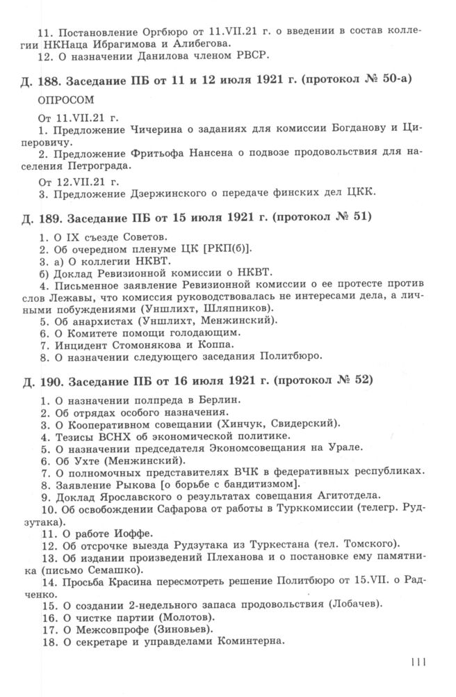 Повестка дня заседания ПБ ЦК РКП(б) от 11 и 12 июля 1921 г. (протокол № 50-а) // РГАСПИ. Ф. 17. Оп. 3. Д. 188.