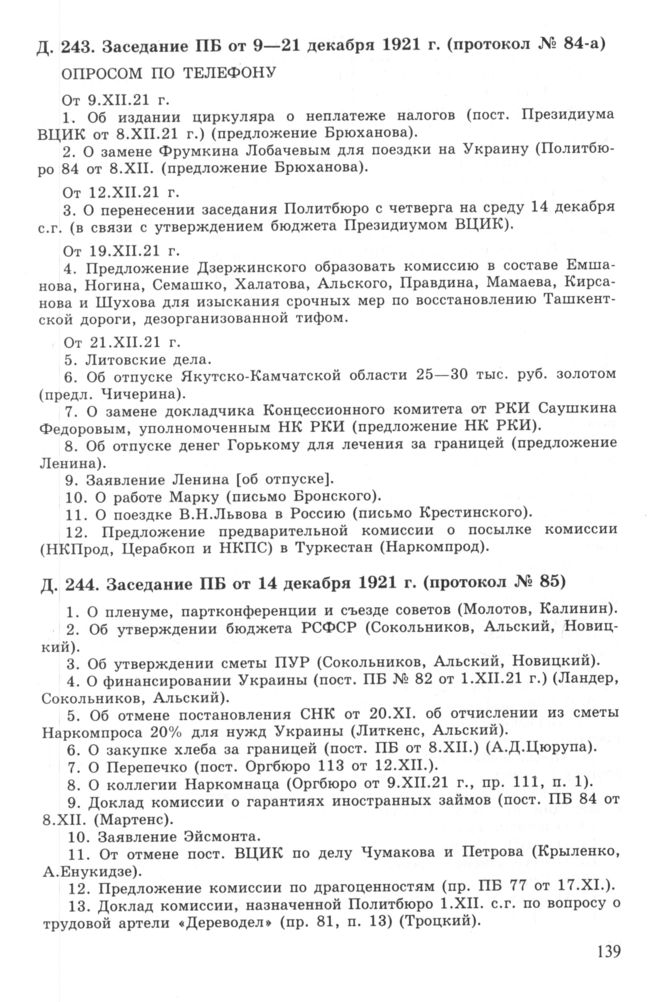 Повестка дня заседания ПБ ЦК РКП(б) от 14 декабря 1921 г. (протокол № 85) // РГАСПИ. Ф. 17. Оп. 3. Д. 244.