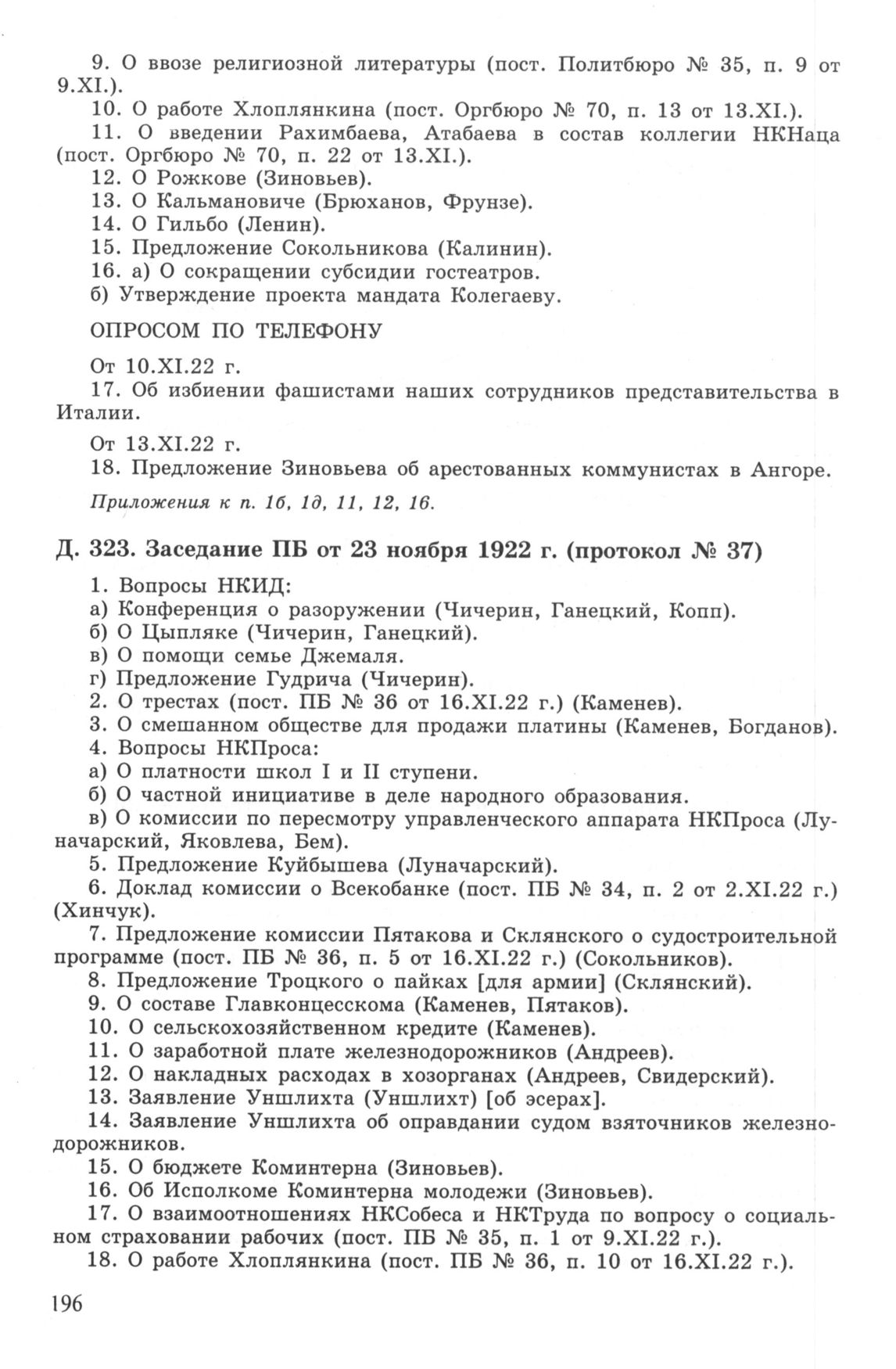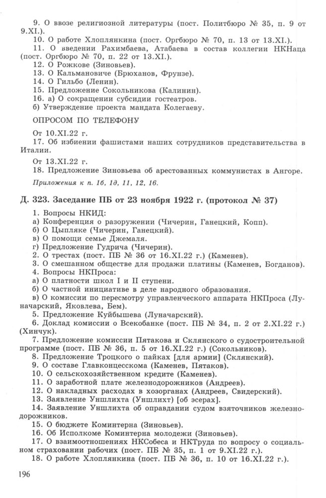 Повестка дня заседания ПБ ЦК РКП(б) от 23 ноября 1922 г. (протокол № 37) // РГАСПИ. Ф. 17. Оп. 3. Д. 323.