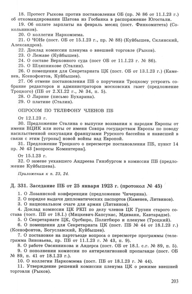 Повестка дня заседания ПБ ЦК РКП(б) от 25 января 1923 г. (протокол № 45) // РГАСПИ. Ф. 17. Оп. 3. Д. 331.