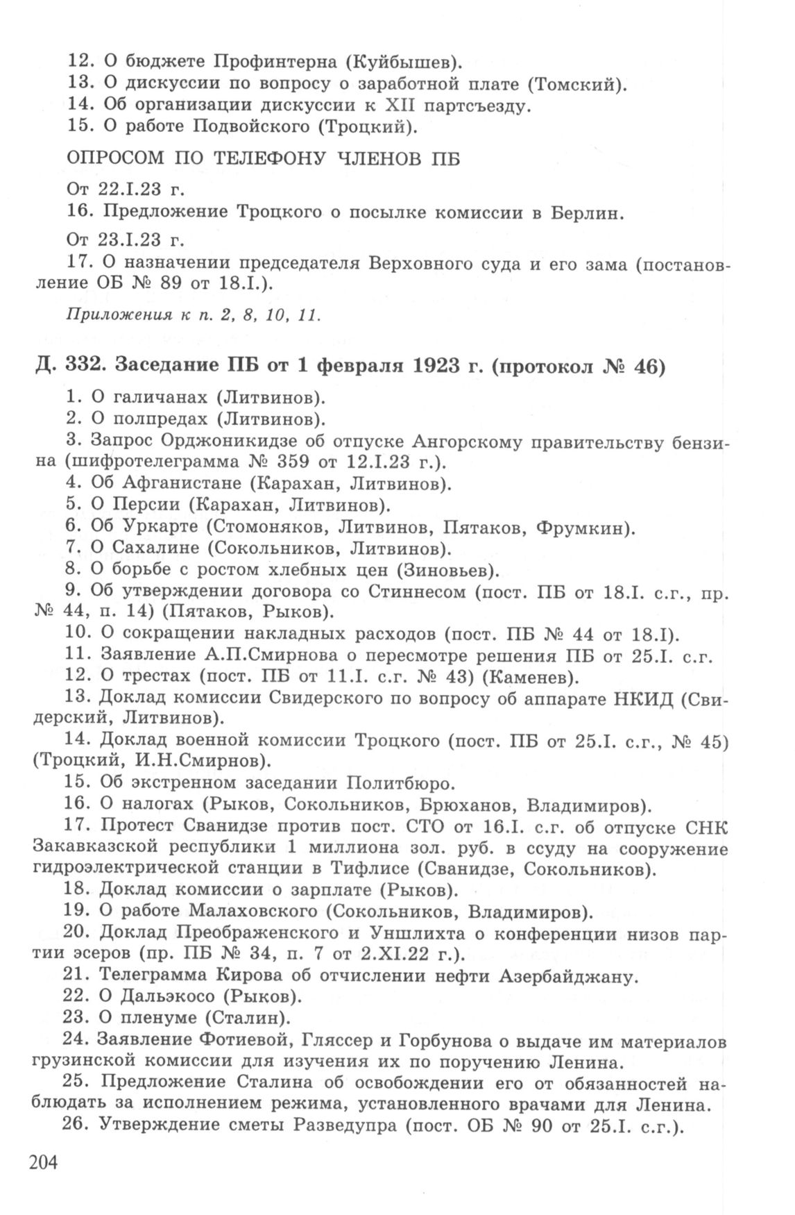 Повестка дня заседания ПБ ЦК РКП(б) от 1 февраля 1923 г. (протокол № 46)