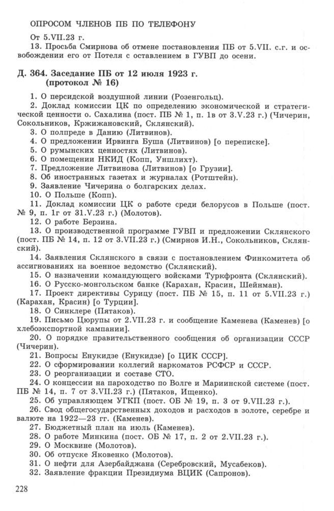 Повестка дня заседания ПБ ЦК РКП(б) от 12 июля 1923 г. (протокол № 16) // РГАСПИ. Ф. 17. Оп. 3. Д. 364.