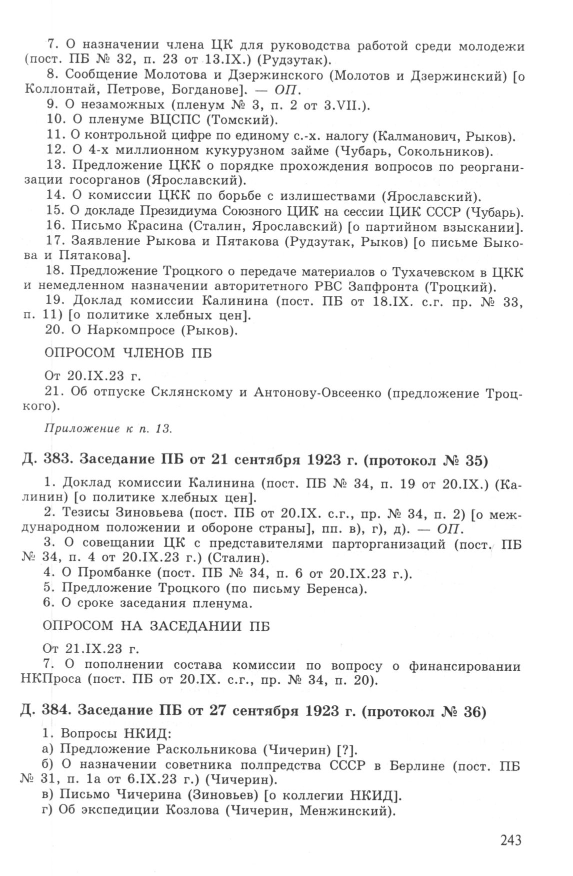 Повестка дня заседания ПБ ЦК РКП(б) от 21 сентября 1923 г. (протокол № 35) // РГАСПИ. Ф. 17. Оп. 3. Д. 383.