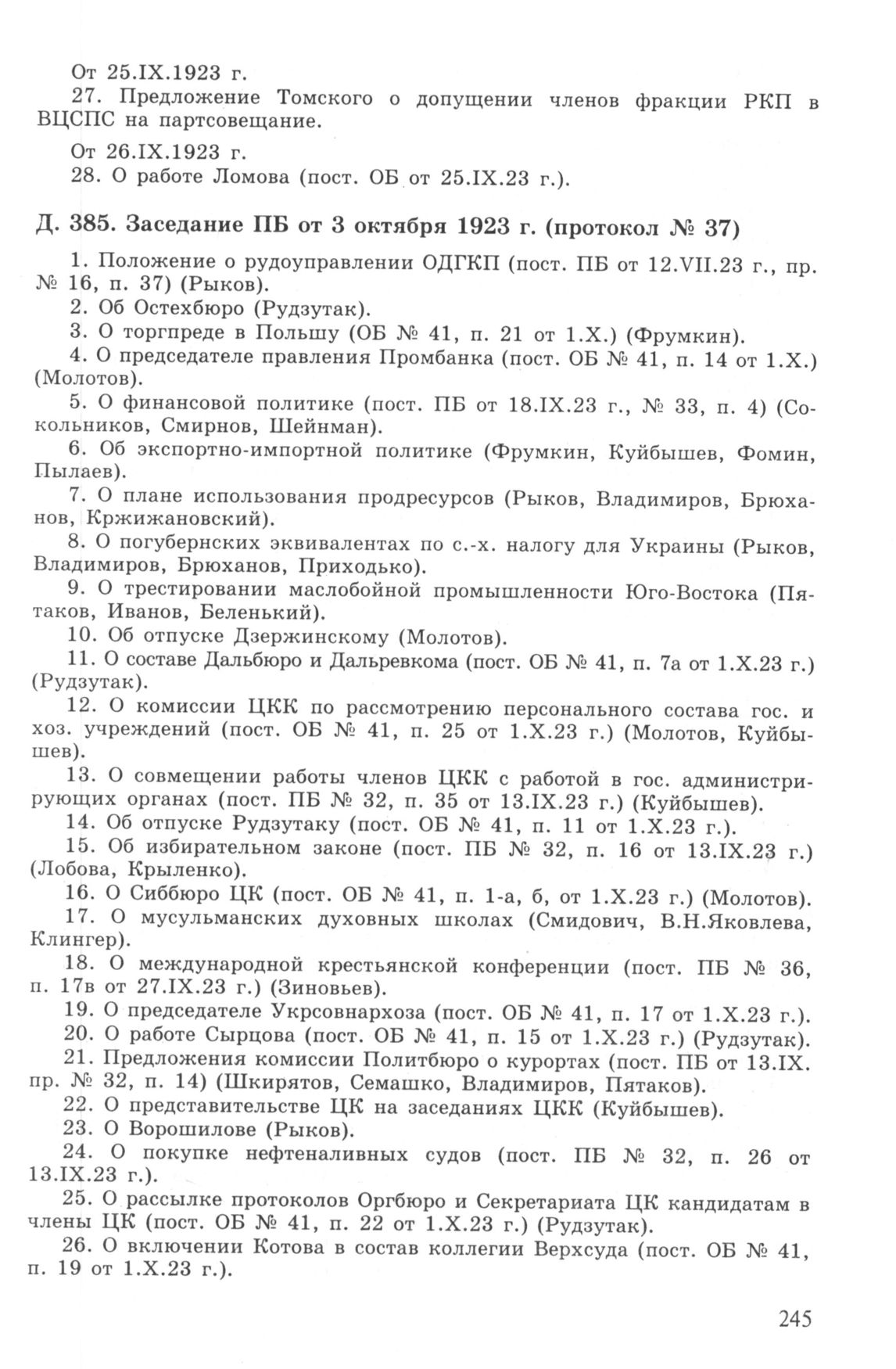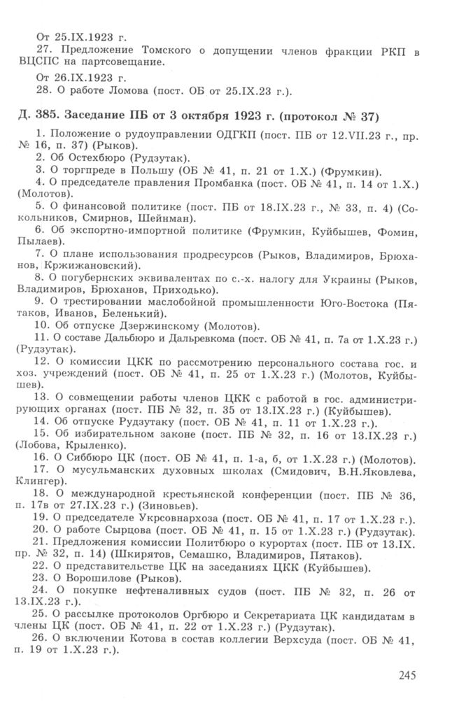 Повестка дня заседания ПБ ЦК РКП(б) от 3 октября 1923 г. (протокол № 37)