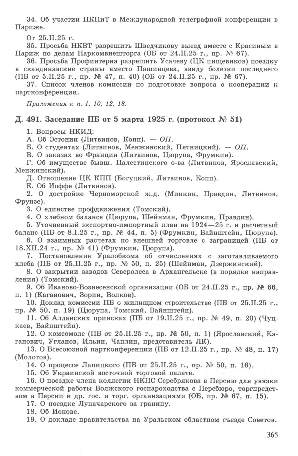 Повестка дня заседания ПБ ЦК РКП(б) от 5 марта 1925 г. (протокол № 51)