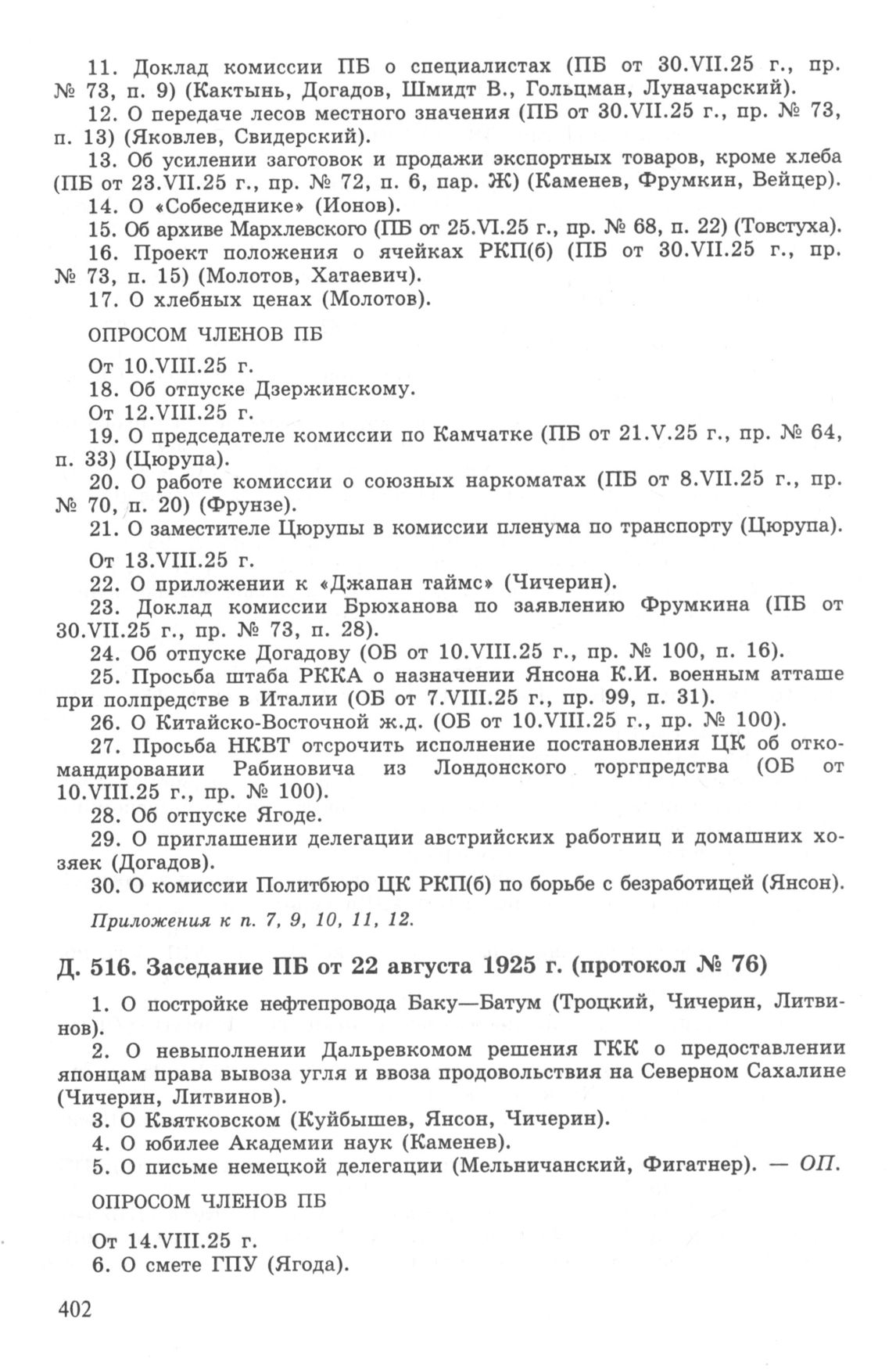 Повестка дня заседания ПБ ЦК РКП(б) от 22 августа 1925 г. (протокол № 76) // РГАСПИ. Ф. 17. Оп. 3. Д. 516.