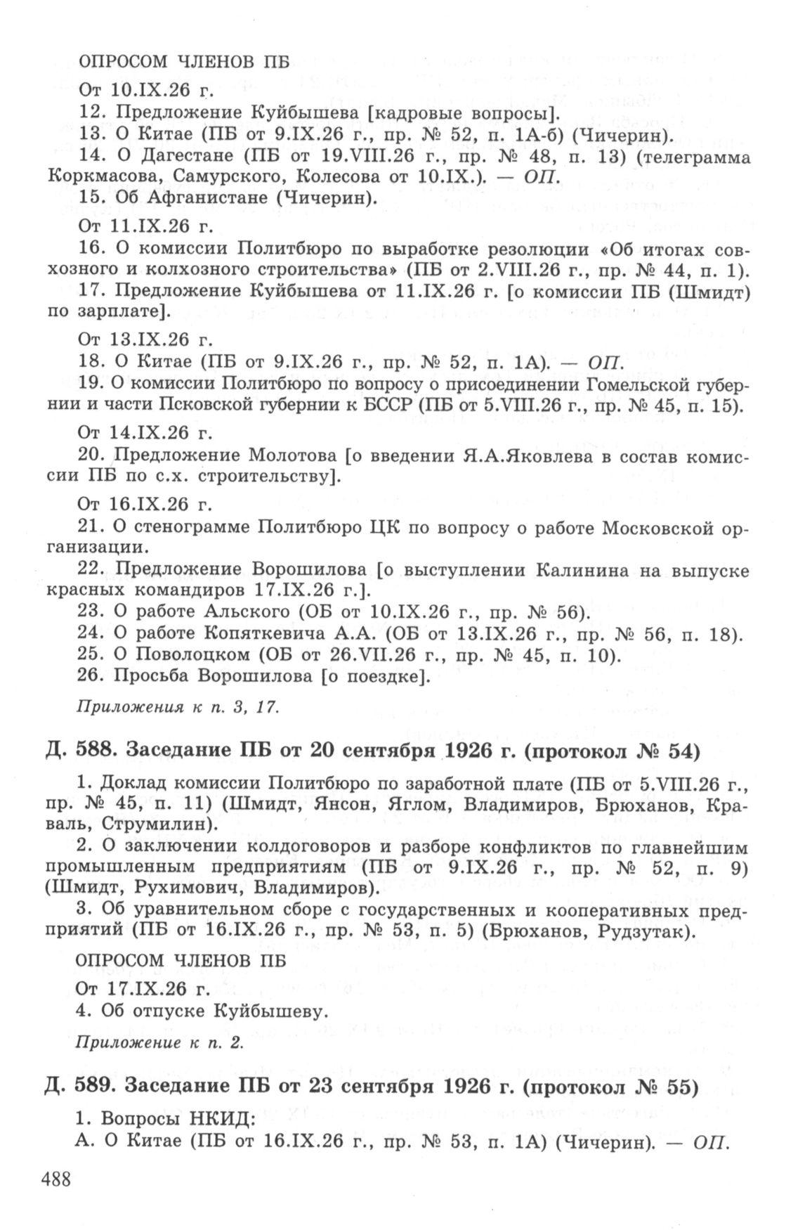 Повестка дня заседания ПБ ЦК ВКП(б) от 23 сентября 1926 г. (протокол № 55) // РГАСПИ. Ф. 17. Оп. 3. Д. 589.