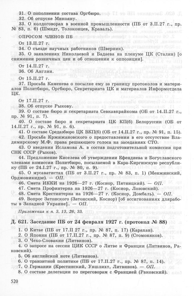 Повестка дня заседания ПБ ЦК ВКП(б) от 24 февраля 1927 г. (протокол № 88) // РГАСПИ. Ф. 17. Оп. 3. Д. 621.